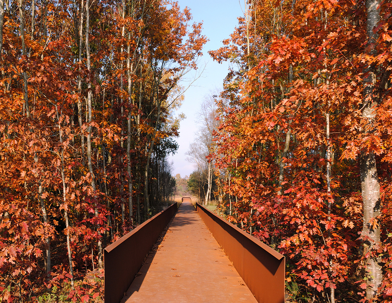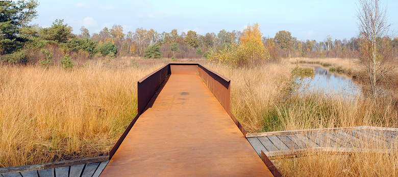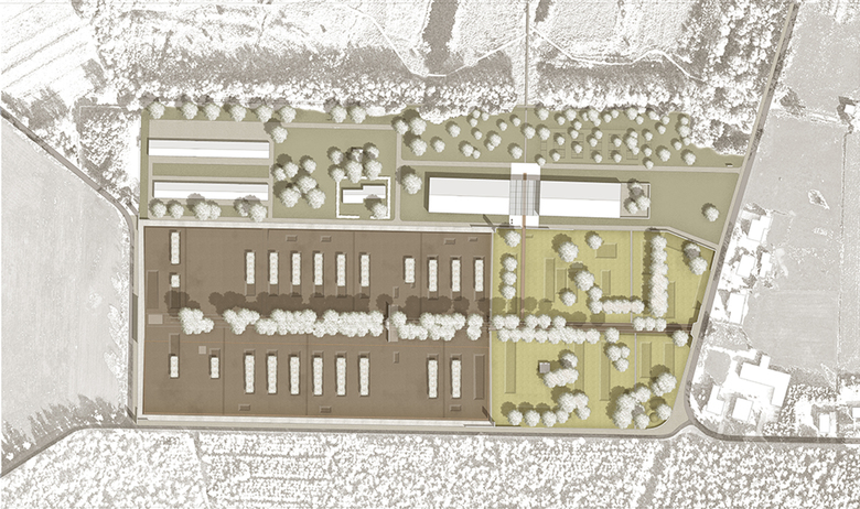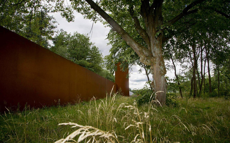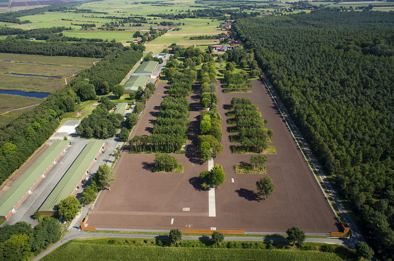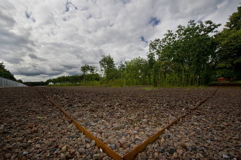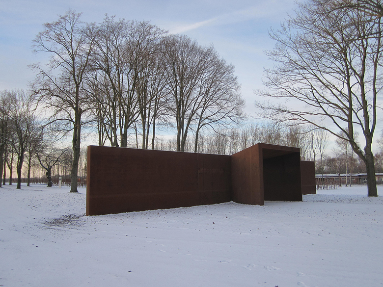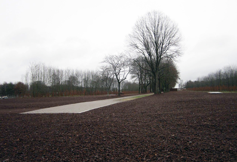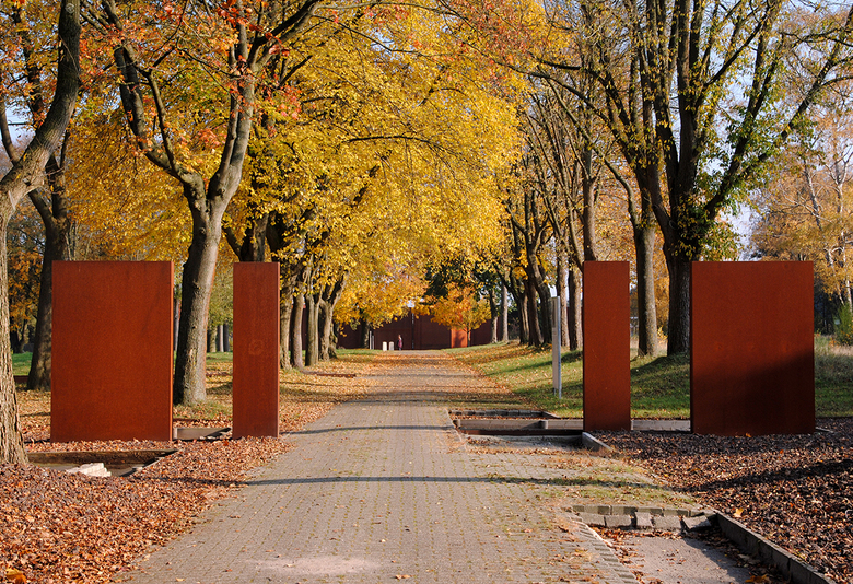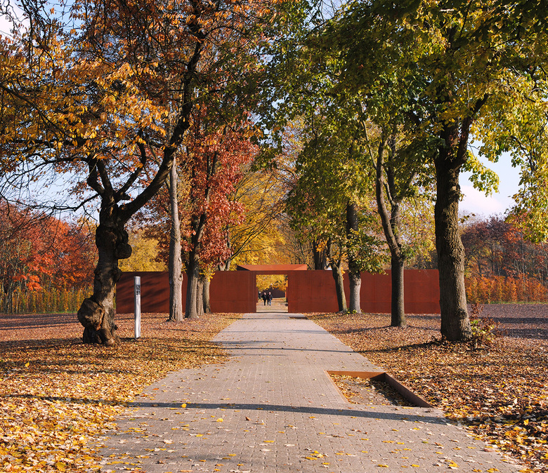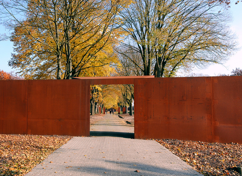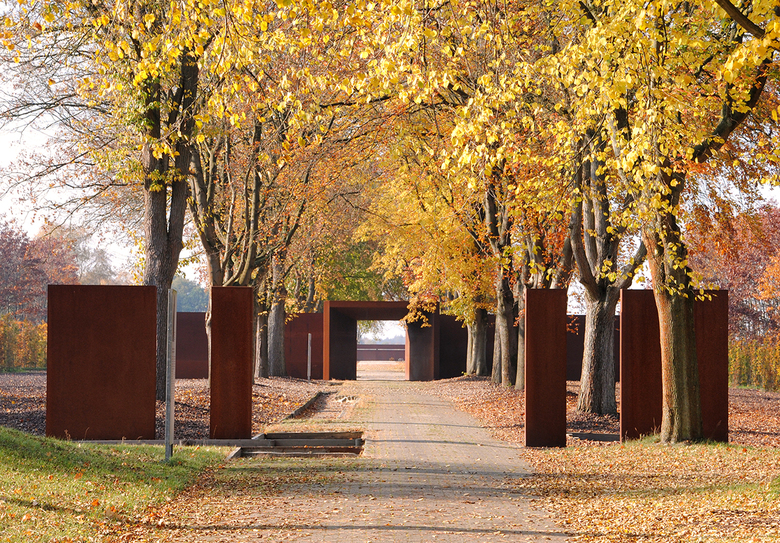 Über dem Boden waren keine baulichen Elemente mehr erhalten. Deshalb wurden aus dem in den 50er Jahren gepflanzten Roteichenbestand „Baumpakete“ in den Abmessungen der Baracken herausgeschnitten. Im Kontrast zu diesem fast parkartigen Bild stehen die Überschotterung des gesamten Häftlingsbereichs und die wuchtigen, scherenschnittartigen Silhouetten der hohen Wände aus Cortenstahl. Sie interpretieren die Wachtürme, den Mauerverlauf und die damaligen Tore.