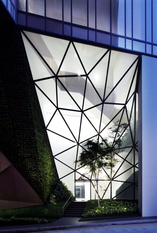 The formal architectural language of fractal, triangulated geometry originated from the need to comply with authority requirements of having splayed corners as the building is bounded by three roads.