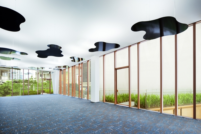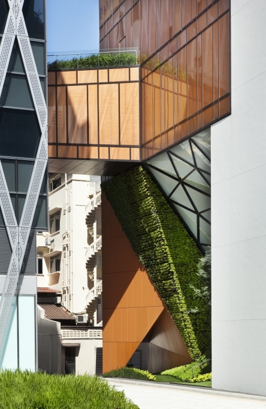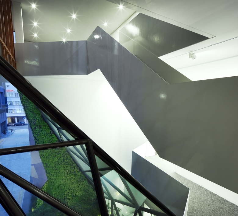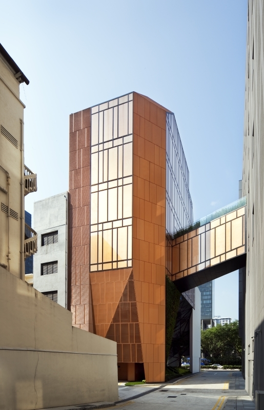 As the original floor levels with their low ceiling heights were retained, the front end of the shophouses was deemed more suitable for meeting rooms, while the service end accommodated a mechanised carpark. The open plan offices within the upper 4 floors was strategically lifted up so that floor plate size is maximised, higher headroom is gained, better views are enjoyed and more natural daylight is accessed from the sides. Every flat roof area is also transformed into roof gardens with the attic featuring the office’s recreational lounge.