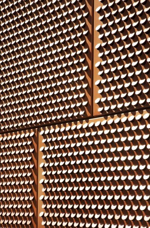 a chiselled expression that was carried through in both plan and elevation, taking the form of internal angled walls and external slanted planes, revealing a concave curtain wall like that of crystal embedded in the hollow lower strata of its atrium park space. Shading was also built into the formal language by means of an integrated sun screen within the curtain wall system and a series of perforated aluminium panels.