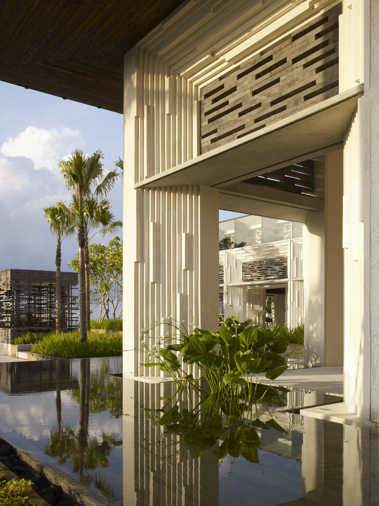 This hotel and villa development is a Green Globe 21 rated ecologically sustainable development. Located on the dry savannah landscape of the Bukit Peninsular on the Indonesian island of Bali, it comprises a 50-suite hotel with 35 residential villas. The development proposes luxury as delight and enjoyment of the natural beauty and sense of place, rather than excessive consumption. The design combines the delights of traditional Balinese pavilion architecture and rural landscapes with modern dynamic treatment of space and form.