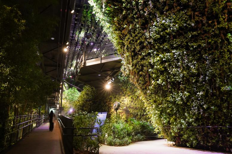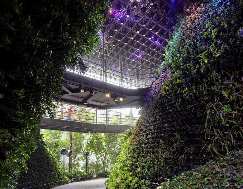 To maximise the usable site area, the design takes a layered approach, stacking multiple levels and functions on top of each other. Visitors will go on an experiential journey by following the canopy walk that meanders through the pavilion’s multiple levels while being surrounded by verdant palms, trees, shrubs and vibrant orchids. The Hanging Garden as well as three thematic cones that are draped in vertical greenery add to this immersive, three-dimensional biophilic experience.