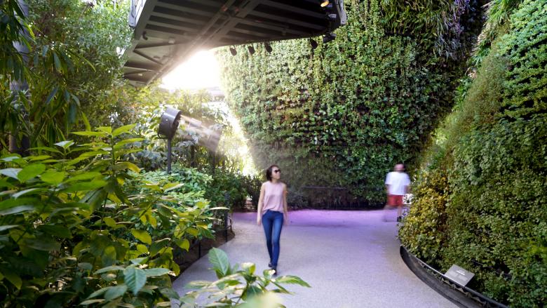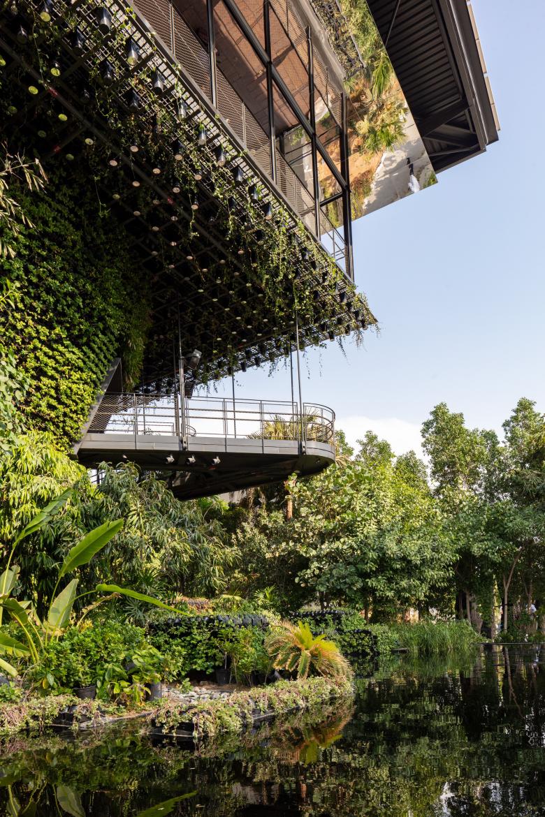 The Singapore Pavilion houses over 170 varieties of plants which will grow to be even more dense and lush over the Expo period. Besides giving visitors a beautiful biophilic experience, the plants provide measurable ecosystem services like solar heat reduction, sequestration of greenhouse gases, reduction of other pollutants such as PM10 particles, oxygen production, rainwater remediation as well as providing habitats for animals.