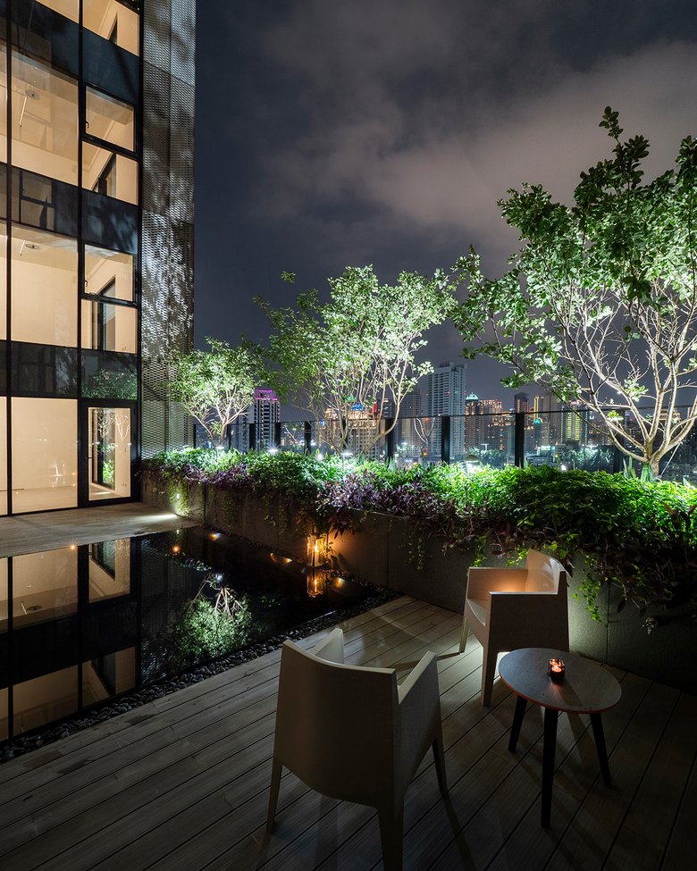 Away from the busy street life an intimate, serene landscaped courtyard greets the residents as they return to their homes. Above the retail shops rise the two residential towers as well as generous recreation facilities for indoor and outdoor activities. Both towers have deeply recessed windows and the façades are enveloped with protruding balconies with trees, sky gardens and mesh screens that serve as a trellis for green creeper plants. Landscaping is treated as a key material in creating the building envelope for the residential towers. The façade elements create deep sun-shading and the greenery acts as an active and living interface between the interior and exterior environment.