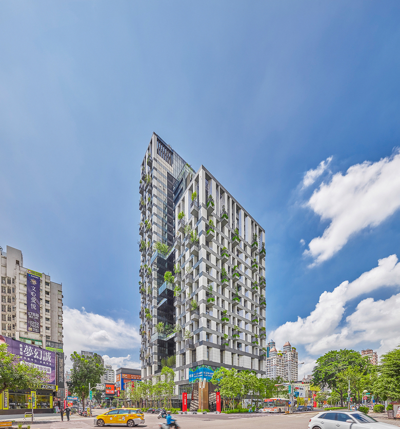 Sky Green is a mixed-use development located at the heart of Taichung in a densely developed and vibrant neighborhood. The site is made up of two rectangular plots, one facing the main city thoroughfare, Gongyi Road, and the other facing Naying Street, a quieter secondary street. The development consists of two 26-storey residential towers with apartment units from level 4 onwards, as well as retail spaces. To connect to its setting, and the hustle and bustle of the streets, the building’s retail spaces are located from ground level to level 3. The shops have staggered patterned glass cladding to give an urban backdrop to the tree-lined pedestrian walkways and modern outdoor street furniture.