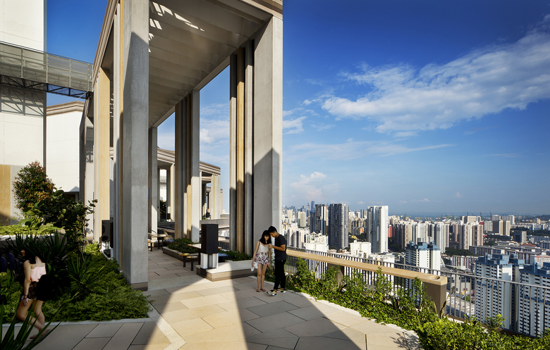 Other community areas include a plaza located along a public linear park flanked by supermarket, coffee shop and retail spaces, and a childcare facility. Community living rooms - large double-volume verandah spaces - at ground level provided with seating areas overlooking a park. Pavilions for weddings and funerals, play and fitness areas, courts and lawns are bordered by a 150m long bioswale. The rooftop public skypark, open 24 hours, incorporates a 400m jogging track under pavilions capped by a photovoltaic array.