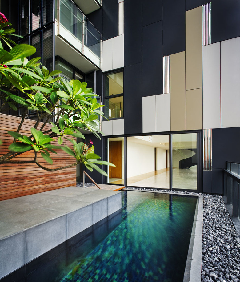 The design is inspired by Thai forms – ceramic tiles, textiles and timber paneling, abstracted and used as a way to organize forms. The cladding, for instance, uses temple tiles as an inspiration, while the staggered arrangement of the balconies recalls the Thai teak staggered paneling on traditional houses. The walls incorporate random inserts of faceted polished stainless steel, a contemporary interpretation of the sparkling mirrors incorporated into Thai temples, returning this delightful glittering effect at a scale appropriate to the vast central city.