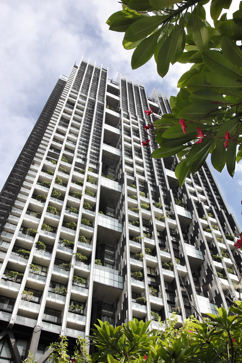 The building is planted on every horizontal surface. Additionally, vertical faces are shaded by green creeper screens, rising up the full 66 storeys. Balconies are provided with private planters. All apartments are cross ventilated, and all face north and south. The staggered block arrangement gives all apartments access to light and air on all four sides. The design encourages and makes possible living without airconditioning.