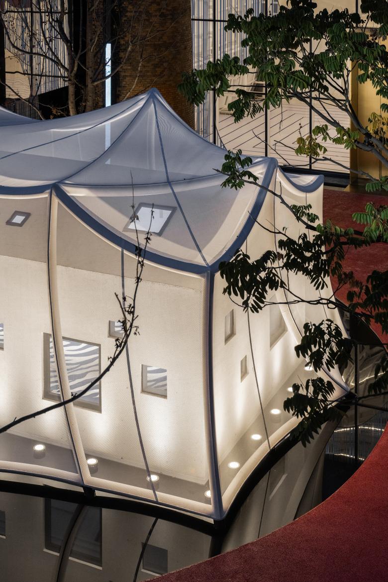 In 2020, due to pandemic control measures, I spent around 40 days accompanying my wife in isolation at the hospital. Initially, Tangtang stayed at a friend's place, and later, a pregnant lady kept her company. Afterward, Tangtang cut her hair. A gentle girl turned into an energetic tomboy. At the beginning of 2023, when I had to give a speech, weakened by illness, I decided to use a cane. Tangtang told me that the cane was ugly and insisted on supporting me herself, becoming my "cane." Over these years, she had experienced nothing less than panic, bullying, and worry. Therefore, I decided to design the duty room into two layers. A translucent PVC fabric curtain wall outlines the white cliffs whereas the interior is a solid geometric form. We look at children from a high vantage point, assuming they need protection and are also vulnerable. However, our children may be resilient. Any setbacks they face will be a baptism for their future exciting lives. This forms the two-layer boundary of the white cliffs.