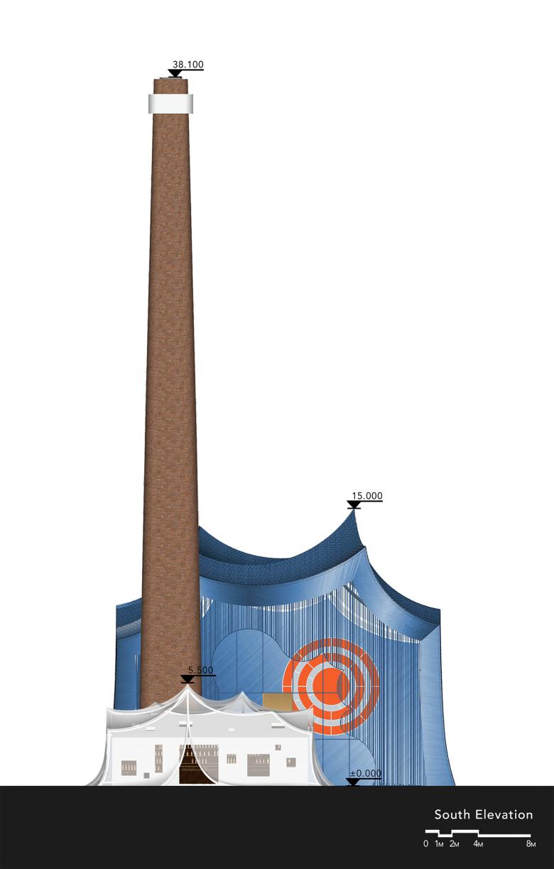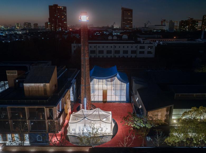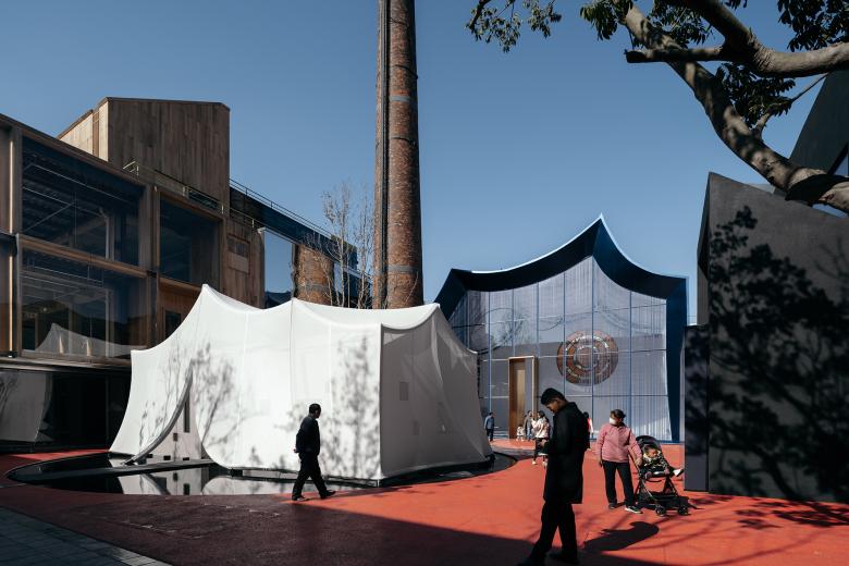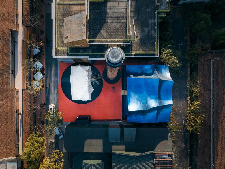 I have always felt that the intricate floor designs in landscape architecture are unnecessary and a waste of money. I covered the entire site with red concrete. In this way, there is a complete background for the entire architectural complex. I retained the chimney, designing it as a lighthouse and signpost. Mr. Zhan, the deputy general manager of our client, asked me what I wanted to change inside. I said, "Turn it into a cigar lounge." Yes, I imagined that I curled up on the sofa inside the chimney, Mr. Zhan and I lighting a cigar with Mr. Zhan, watching the smoke slowly drift towards the well-like sky. Perhaps, at that moment, it's most relaxing moment for us busy middle-aged individuals.