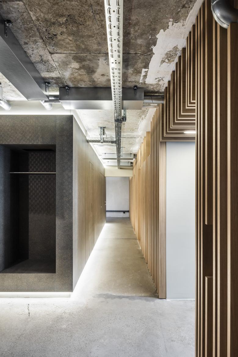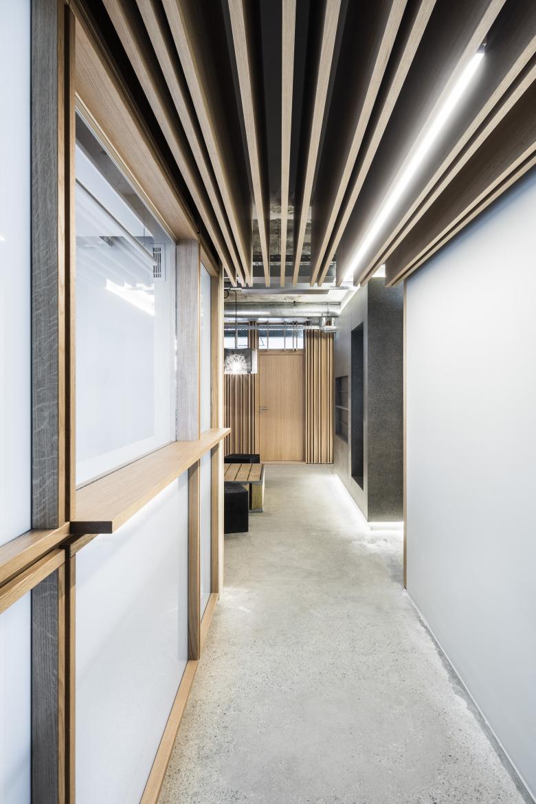 Im Eingangsbereich wurden die vorhandenen Materialien und Installationen roh belassen. Ergänzt mit einem Kern aus zementgebundenen Spanplatten und den Vertikallamellen aus Eichenholz entsteht ein ungewohnter, intensiver Raumeindruck, der keineswegs an eine Praxis- oder Klinik-Atmosphäre erinnert. Die Spuren der Vergangenheit des Gebäudes werden erlebbar, Fehler haben Platz! In den Behandlungsräumen ändert sich dann die Stimmung, sie wird persönlicher, wohnlicher.