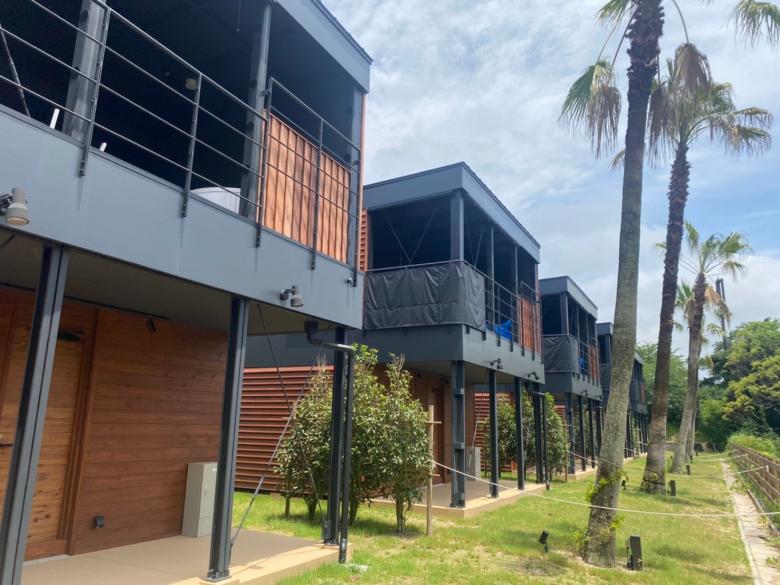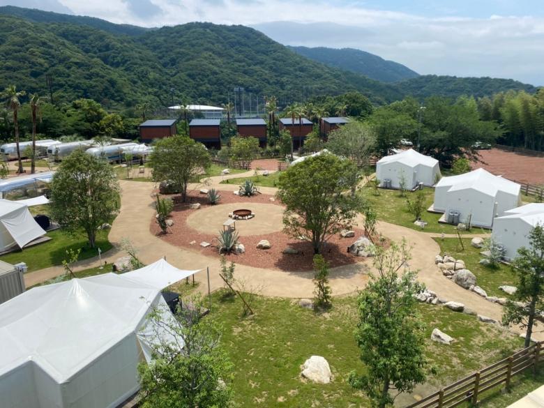 We were tasked with tearing down an old hotel in the Chikuho Ryokuchi area, and then afterwards had discussions with Iizuka City Hall, in which we planned the project for a new hotel and glamping facility on the remaining 22,000 square-meter site. The selection of the hotel placement was also decided by us, the landscape-design side. We also directed the building of the glamping facility's cottages and tents, including the construction work. We went all the way to the U.S. to purchase an Airstream, which once acquired was skeletonized and interior work was done. The whole atmosphere is inspired by Palm Springs.