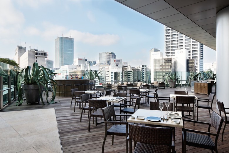 We took charge of the stone-work for an interior space and terrace greenery of a restaurant in the Tokyo Garden Terrace building. The design included an entrance sign and a three-meter counter wall, utilizing a one-ton monolithic piece of ena stone. Within the terrace, we placed architectural agaves to accentuate the exotic experience. We also attached caster wheels to the containers, so that they can be easily moved when the restaurant hosts an event.