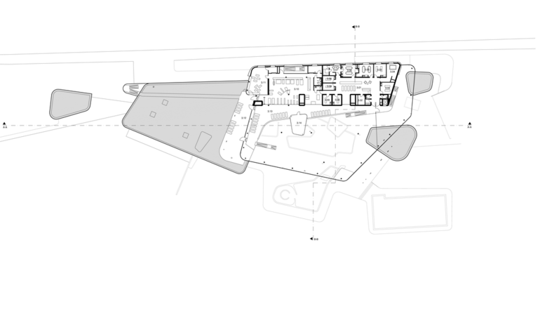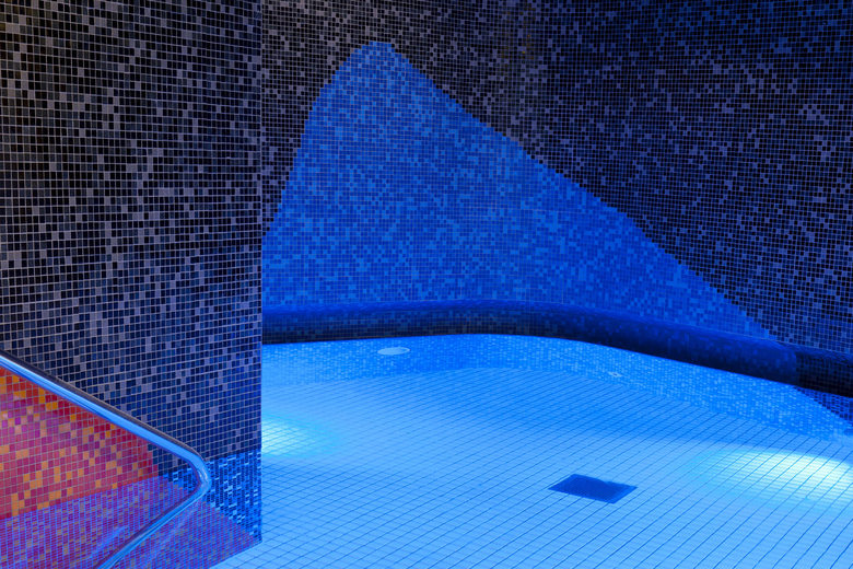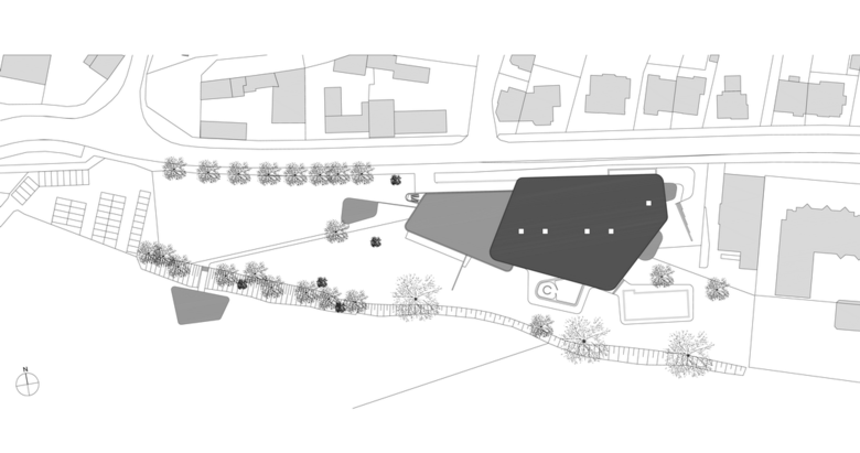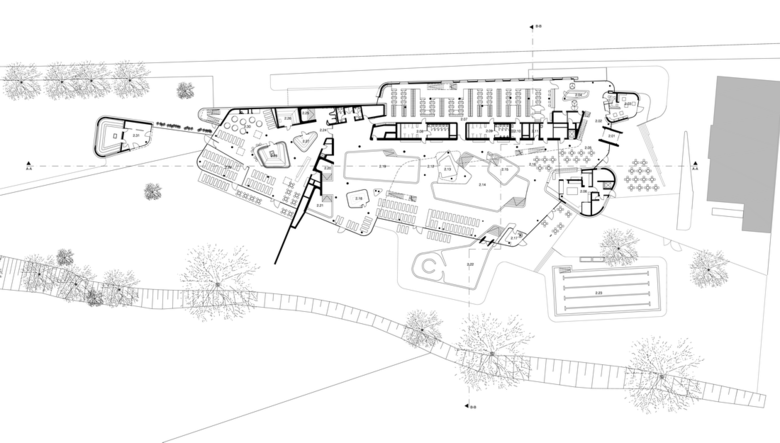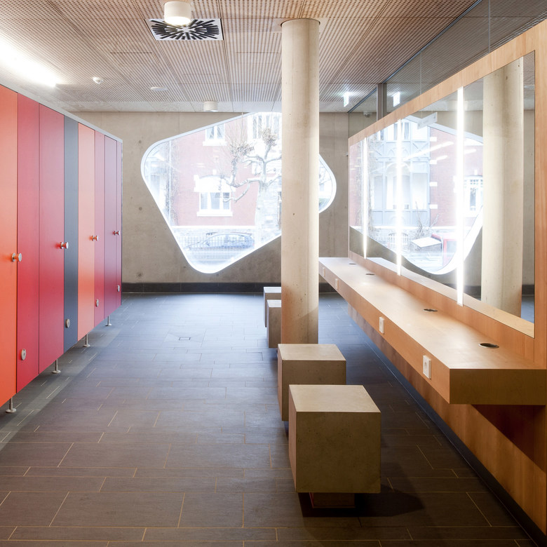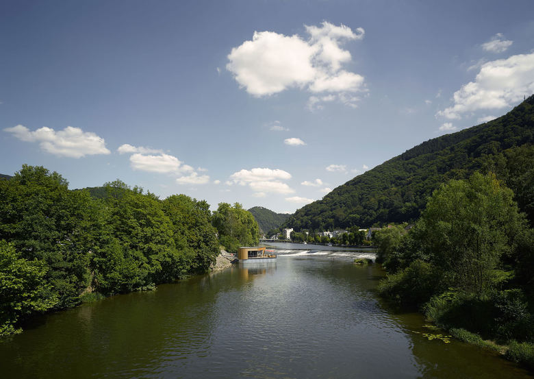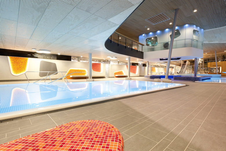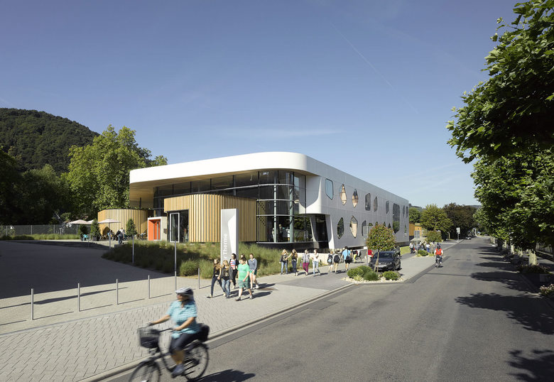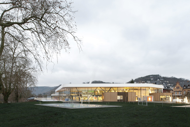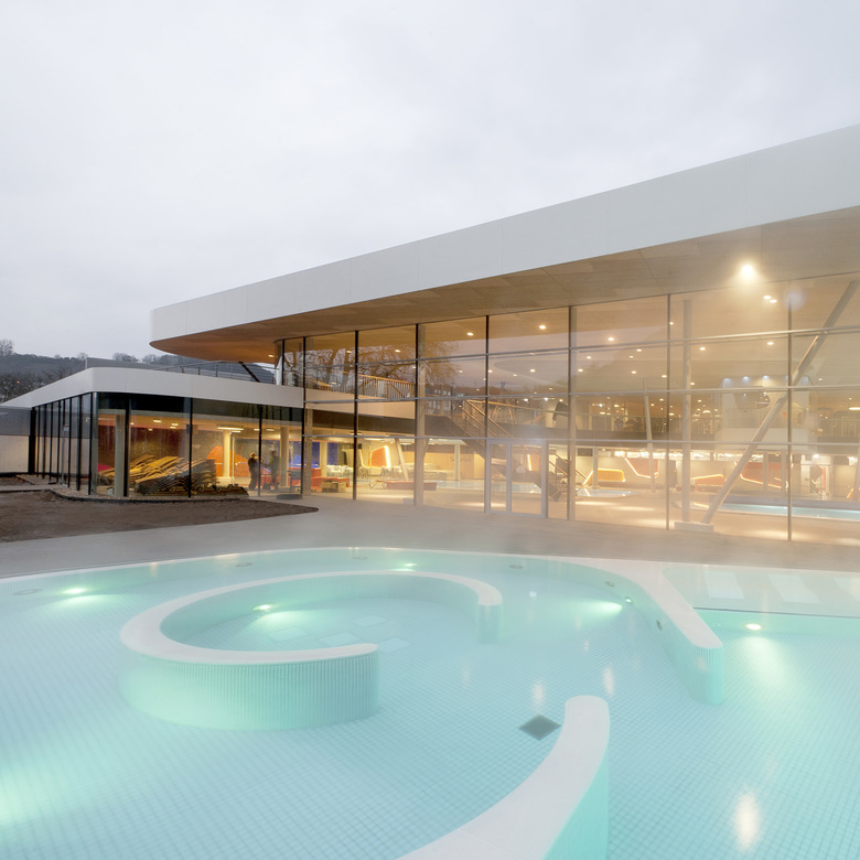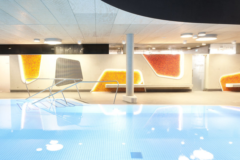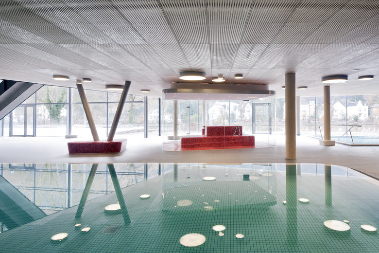 One recurrent theme in the design of the baths are the river pebbles that can also be found along the banks of the Lahn. It appears in the shaping of the individual building structures, the swimming pools and in the façade openings. The element of pebbles is also of central importance in the mural designs of the interior. Moreover, the materials used in the baths also capture the characteristics of pebbles. The individual building structures are shaped with their volume like a variety of stones that are layered and overlap like pebbles on a river bank. Located at the centre is the bathing hall – spacious and generously constructed, this forms the largest element. The sauna wing leads off from the bathing hall towards the west. With their distinctive pebble-like shape, the two building structures which accommodate the dining area and the shop slip into the overall volume of the bathing hall. Particular eye-catcher are the pebble-shaped sections in the north façade. The asymmetrical apertures give the side of the structure facing toward the town centre a lively and cheerful appearance.