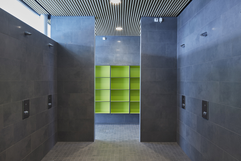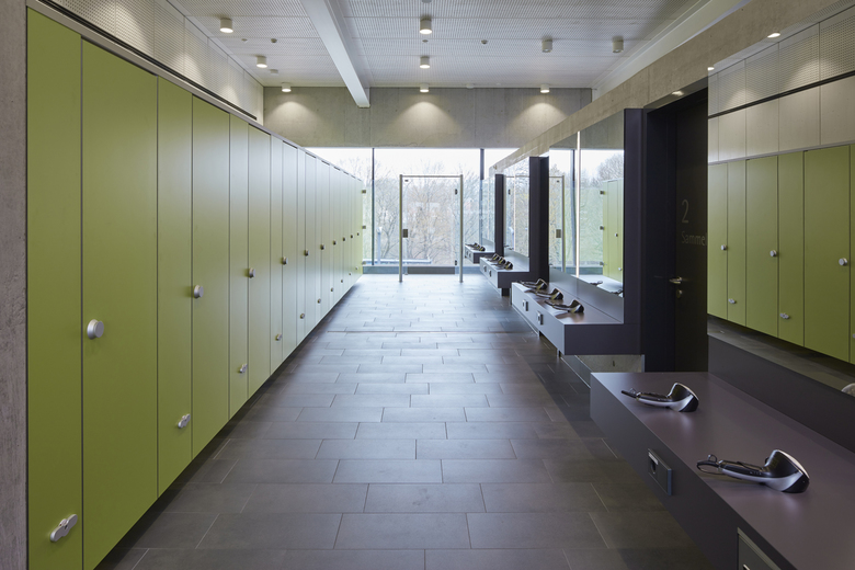 The site for the new pool is located on the northern outskirts of the city of Riedlingen, in the immediate vicinity of the school campus with a middle school and a grammar school. The indoor pool will be used primarily by schools and clubs with provision for additional use by the public. The building is set on a slope and towards the northeast it forms a two-storey construction. An exterior staircase leads the visitor from the car park straight to the upper main entrance. From the entrance area on the ground floor, ceiling-high glass façades allow a clear view into the swimming area, creating a dialogue between arriving visitors and swimmers. The ground floor is clearly structured and into four zones: entrance hall, changing rooms, connecting sanitary area and swimming hall. The swimming hall is glazed up to the ceiling on three sides, giving rise to a generous feeling of space. Wooden decking will be provided in front of the narrow side of the building to the southeast, allowing views across the neighbouring open spaces. With its uniform façade, the ground floor forms an eye-catching structure. The changing materials towards the basement and the overhung barefoot walkway give the ground floor a floating appearance.