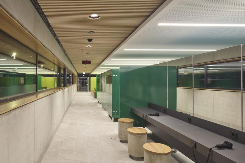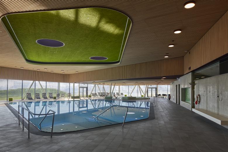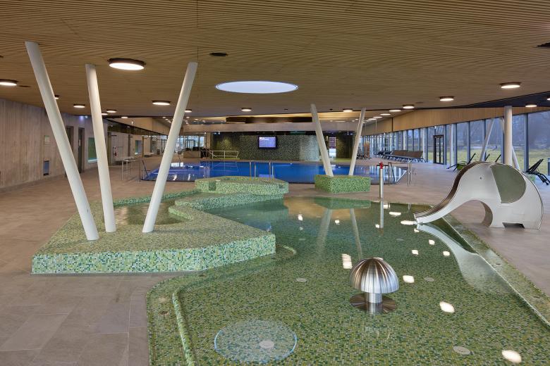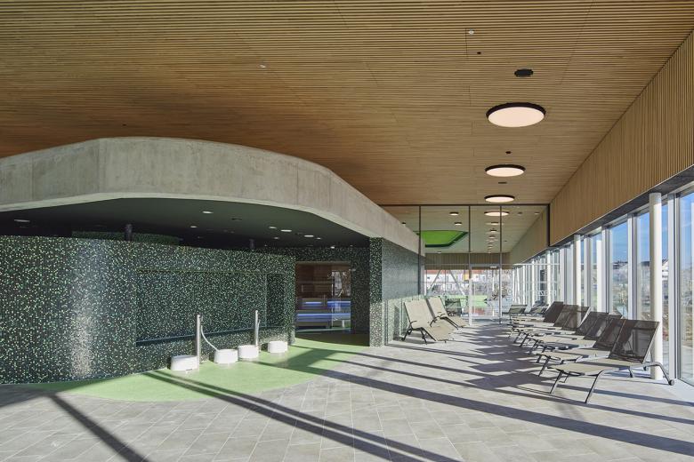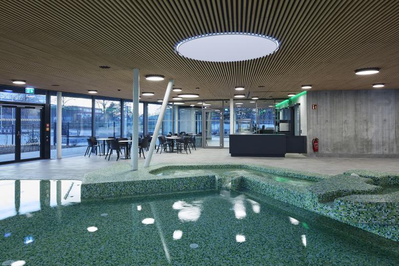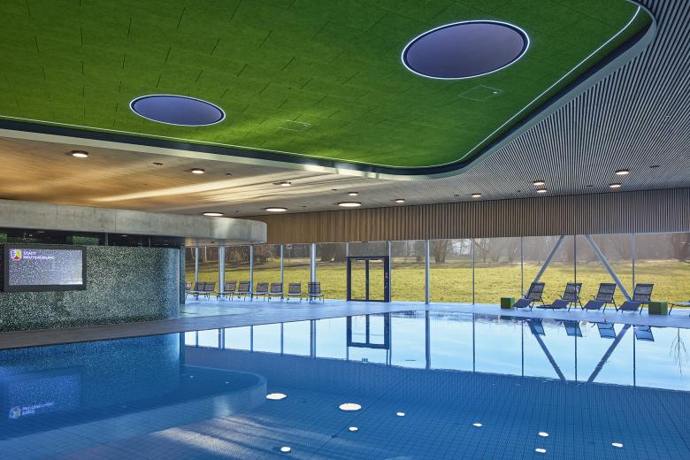 In the center of the building, between the leisure and sports areas, is the wellness zone with steam baths, showers and relaxation areas. Glazed walls between the different zones provide good orientation and maintain the spacious feeling of the bathing hall. Inside, friendly, natural and robust materials that are durable and easy to clean lend the new indoor pool a feel-good atmosphere.