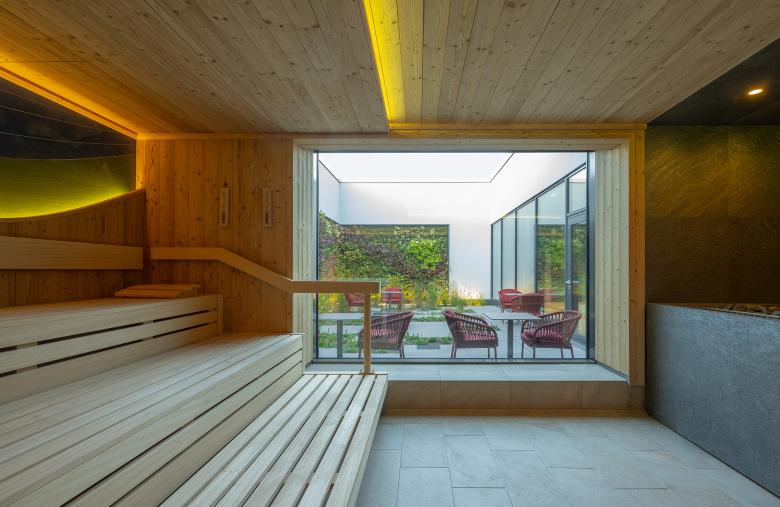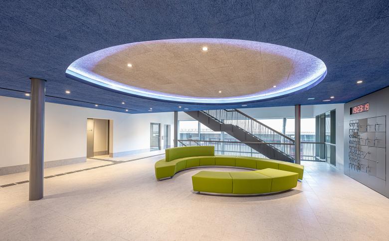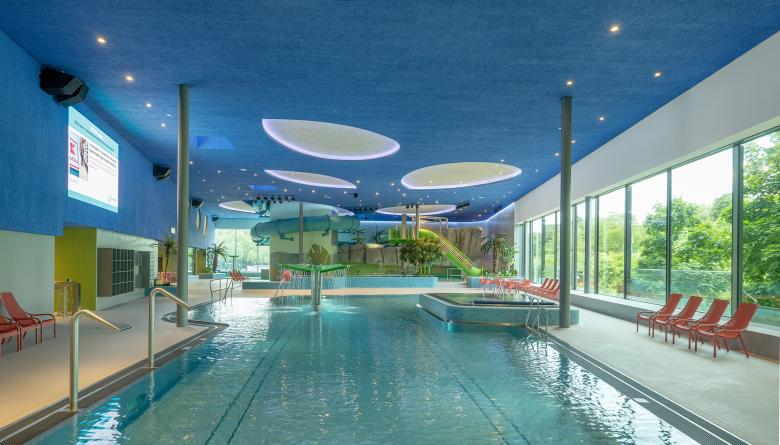 The recreational bathing hall offers numerous attractions: an adventure pool with a water mushroom and hot whirlpool as well as a toddlers' area, the numerous attractions of which invite children to play. Additional bathing fun is provided with a wide wave slide and – with an eye to energy efficiency – an entirely indoor tube slide. The sports bathing hall has a 25-metre pool with six lanes, one-metre and three-metre diving boards, and a partially variable depth that can be set by means of a lifting floor. The offering is rounded off by a separate learners’ pool with wide access steps. The upper floor comprises a spacious sauna area with five different saunas. A green atrium provides a natural atmosphere, daylight, and a high quality of stay. Relaxation and fireplace areas, a catering area, and an outdoor area with a plunge pool, cold showers, and a sun terrace enrich the facilities. The attic also houses another relaxation room with a view of the surrounding area.