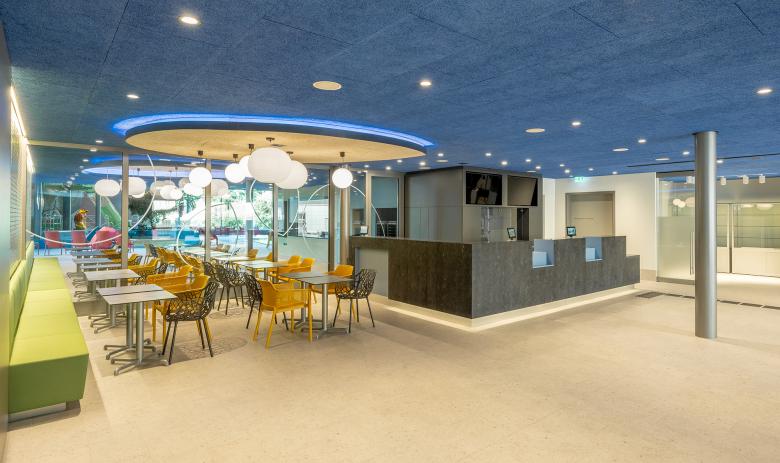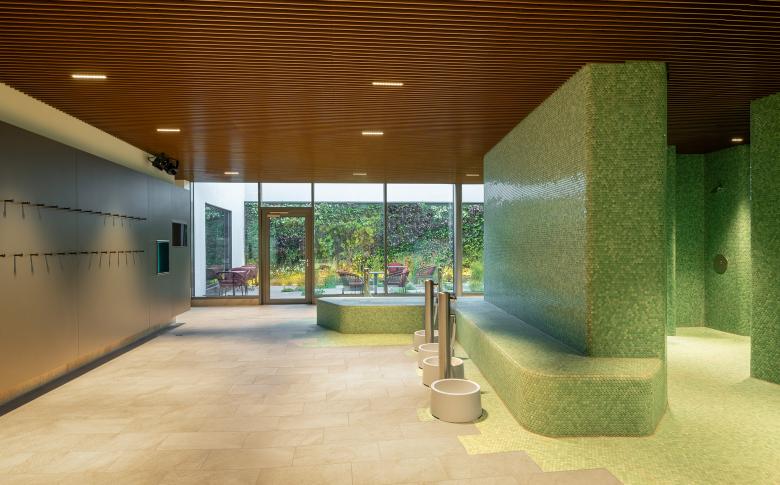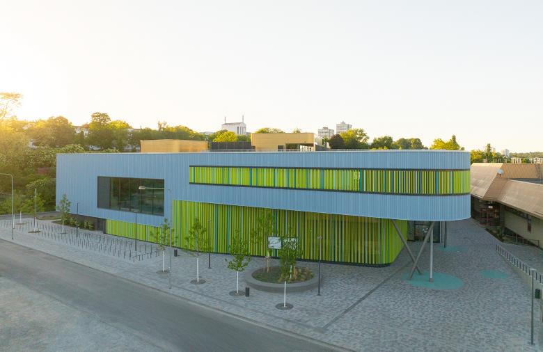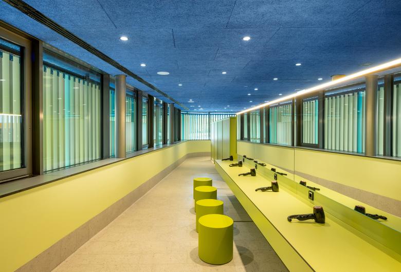 Acting as general planners, 4a Architekten have developed in close proximity to the ice rink a three-storey building that fits compactly into the existing urban structure and makes efficient use of the available space. The new Main Bad offers around 900 square metres of water space for leisure, sport and recreation. The design is characterized by a clear, minimalist design language. Sinuous curves and a recess in the façade in the entrance area lend dynamism to the basic triangular form. The interior is dominated by tiles, plastered surfaces, and acoustically effective surfaces, which not only have a calming effect in terms of design, but are also particularly easy to clean and maintain. The colour concept relies on strong shades of blue, green and yellow to create a lively atmosphere. The façade has a differentiated appearance: The plant-covered base storey is followed by a perforated aluminium shaft with coloured metal slats and glazed elements. Here too, a calm and structured material and colour concept dominates.
