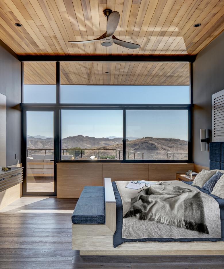 on the upper level, which contains the primary bedroom, home office, two secondary bedrooms, linear balcony, and lounge deck.