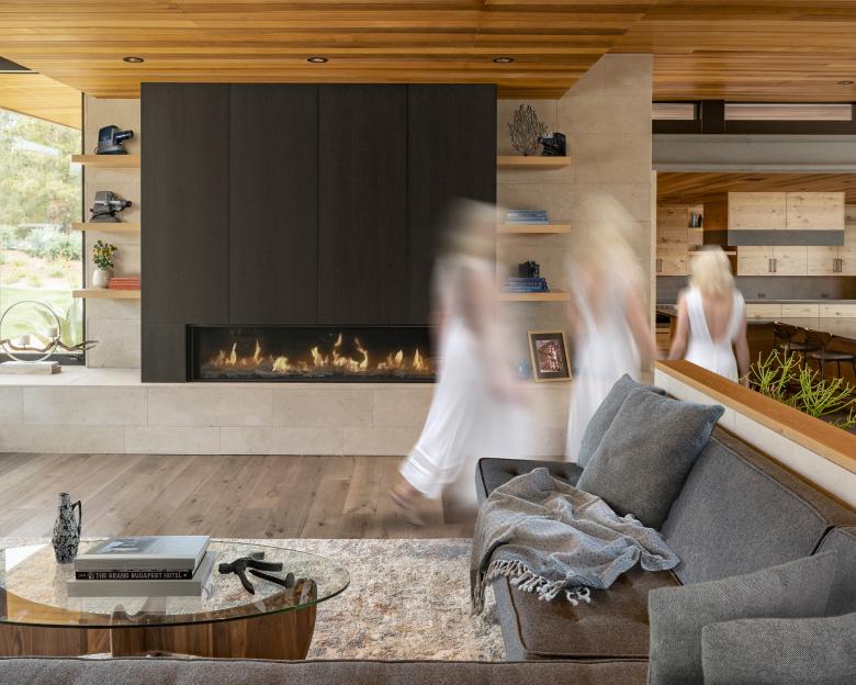 The pool terrace and adjacent open-air living room unfold onto the meadow and ultimately the arroyo below, augmenting a natural, preexisting path for animals with a minimally delineated walking loop with which to explore the site. The sensitive nature of the fire susceptible landscape, as well as the unique climate, solar, and seasonal conditions called for careful positioning of the home, as well as consideration of plant specifications and irrigation requirements.