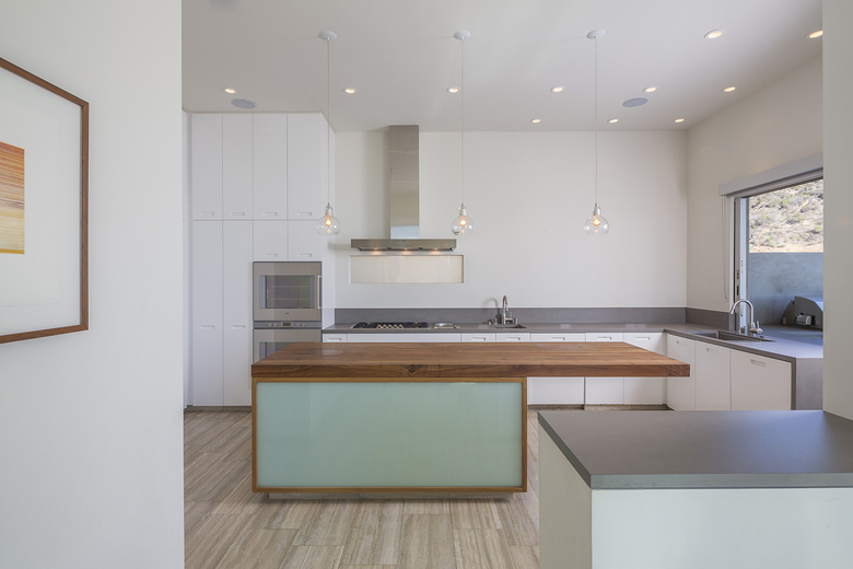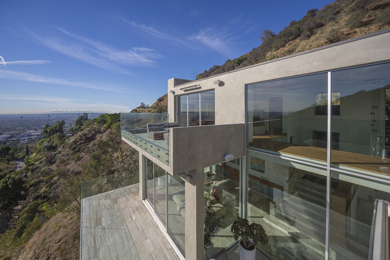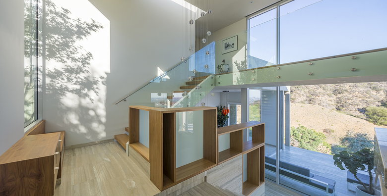The site for this 4000 sf residence consists of a steep descending hillside property within the Hollywood Hills. Constructed adjacent to the street to permit access to the foyer and garage, the home’s entry experience is developed to screen the courtyard and stair hall from passing automobile lights and noise. In contrast, and due to the potential for panoramic views of Los Angeles and the adjacent Runyon Canyon and Wattles Canyon Parks, our design approach focused on creating transparency at the rear of the home with fixed and operable floor to ceiling glazing, opening the entire home to the environment.