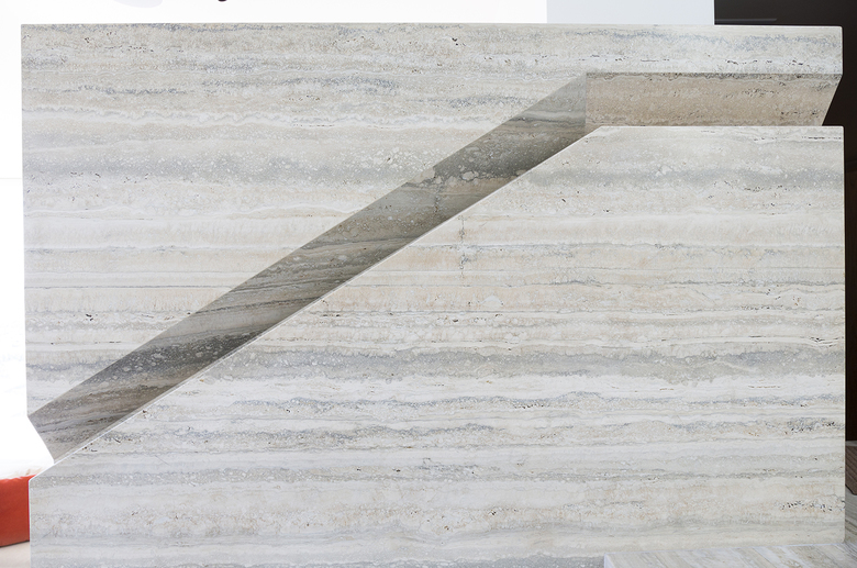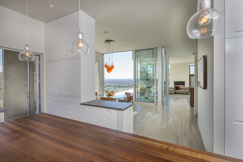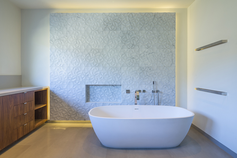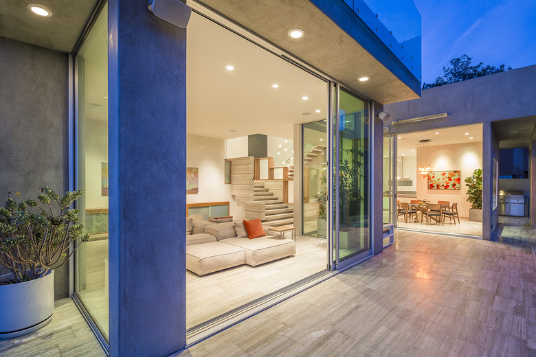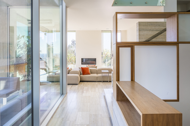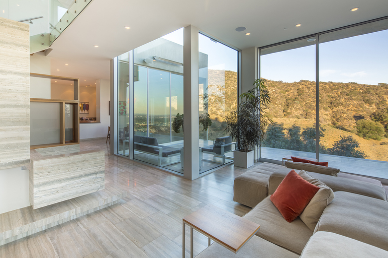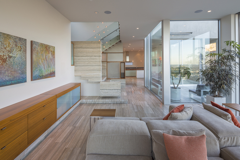 The terraces and gardens encircling the home were also designed to complement the interiors. Travertine was installed within the interior and exterior to create a natural transition between the environments. The entry garden is framed and incorporated within the stair experience.