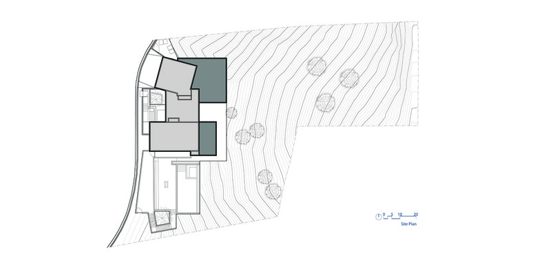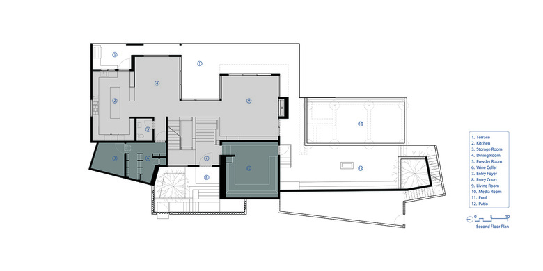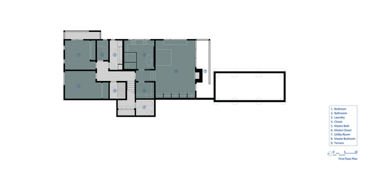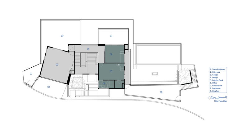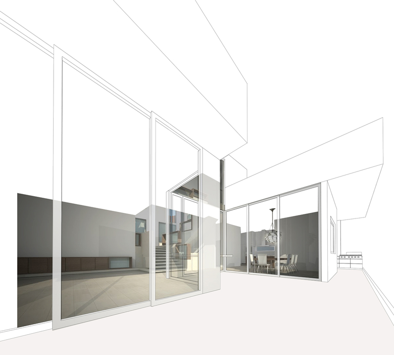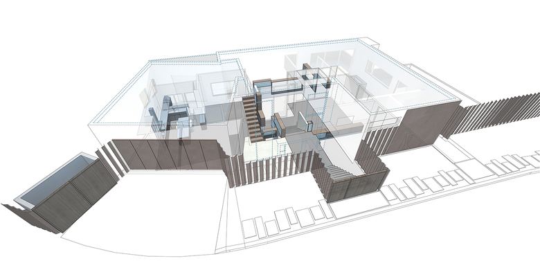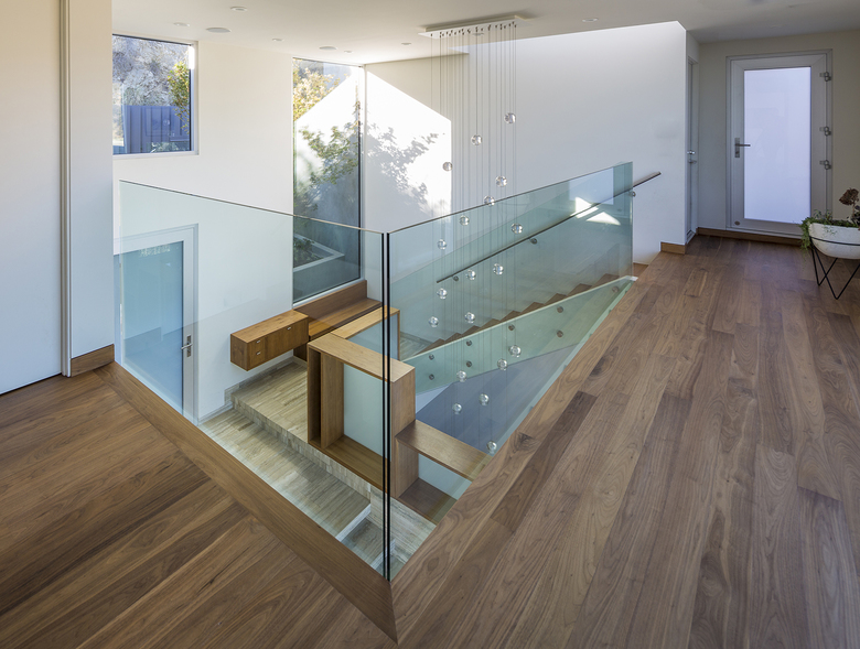In addition, the middle level of the home is open to create semi-autonomous, but connected living spaces. The main stair core was configured as a "stair room" that mediates the three floors of the house. This room is fitted with varying scales and dimensions of stairs, display areas, and materials to enrich the experience and to present the stair as a sculptural element within the center of the home. The triple height stair core, in conjunction with strategically located operable windows and skylights, acts to naturally ventilate the residence, and provide access to all floors.