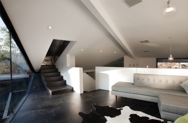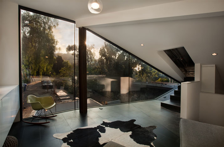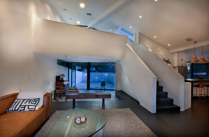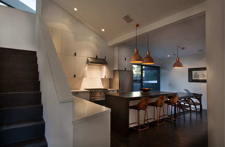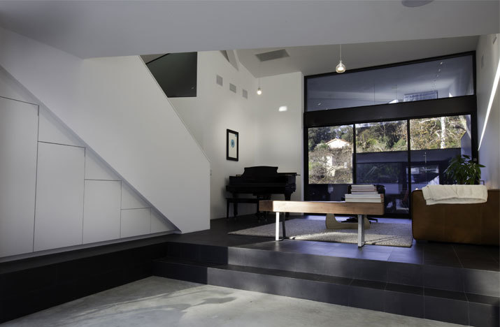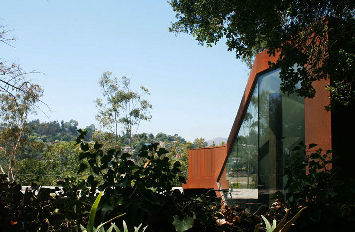 The project site for this residence is a 7,500 sf cross slope lot in the Silver Lake neighborhood of Los Angeles. The property is located near the top of a significant hill with panoramic views towards the Silver Lake Reservoir. The residence is situated at the rear of the property providing ample garden spaces at the front to buffer the exposure to the high traffic street. Due to the adjacency of neighboring properties, primary opportunities for open space occur toward the East and West, while views are primarily to the North within the parcel. The project challenge consisted of solving the interface of the living and working environments for a young couple – one a transportation designer at BMW tinkering with independent projects after hours and the other an artist running an active letterpress studio. Due to the owners’ desire for a conjoined residence and studio, coupled with our interest in passive environmental controls, and the potential for expansive views of the Silver Lake Reservoir and surrounding hillside topography, the strategy for this live/work residence emerged as a series of tightly stacked spaces unfolding and engaging the multiple landscapes of the site. A small commercial letterpress operation shares space with an industrial design studio at the garden level. This studio has separate access directly from the entry path and parking. The densely packed studio is contrasted by the sparse living quarters that occupy the main floor and the mezzanine above. The studio and the private components of the residential spaces above are clad in a dark stained cedar siding, while the public spaces of the residence are wrapped in a weathering steel exterior skin. The steel skin and its associated plaster interior liner form a spatial manifold that envelops the residence and provides autonomy between program as required, while expanding the compact interior living spaces into the landscape at every opportunity. This expansion effectively doubles the useable living space of the residence. The sectional geometry of the residence, the multiple operable apertures located around the perimeter, and the operable hatch connecting the mezzanine and the roof deck completes the passive environmental cooling strategies employed. Through the adjustment of the various building apertures, stack ventilation and convective cooling is achievable.