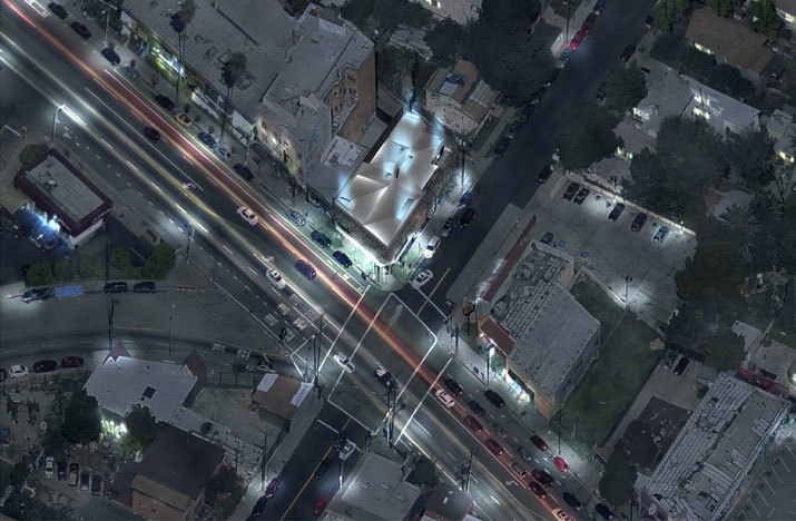 Located at Sunset Junction in Los Angeles, the project site is a 5,000 sf corner parcel currently housing a relic of the neighborhood’s not too distant past, the adult video and book store Circus of Books. The commercially zoned property is situated within the heart of the Silver Lake neighborhood, with adjacent boutique shops, restaurants, bars, and a music school on Sunset Boulevard and both single and multi-family residences on the perpendicular streets. Due to its position, wedged between Sunset Boulevard, Sanborn Avenue, Wit Place, and a one story commercial building, the site has four exposures to incorporate within the development of the building design.