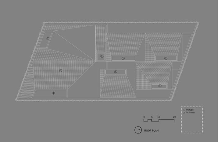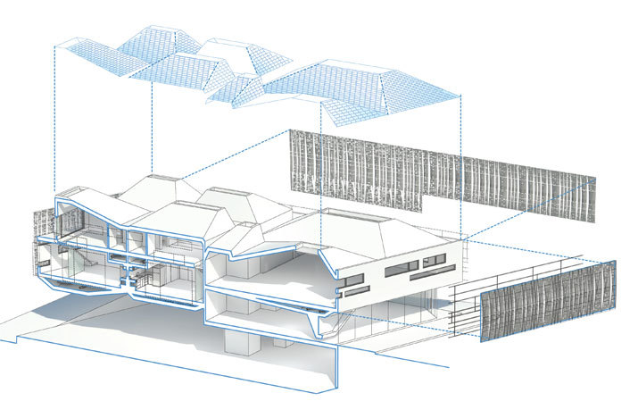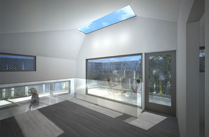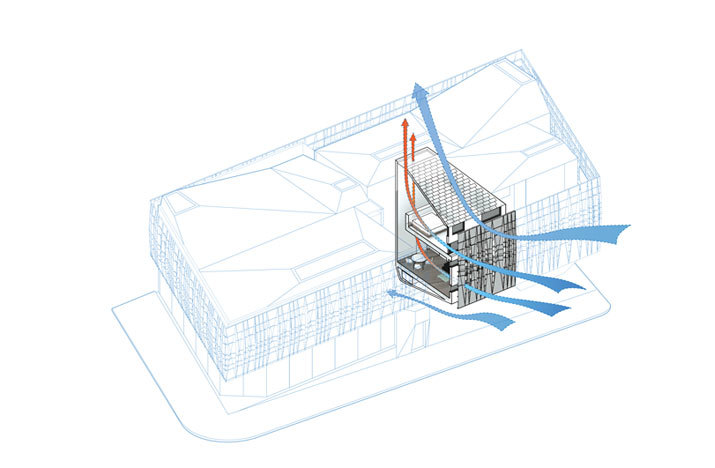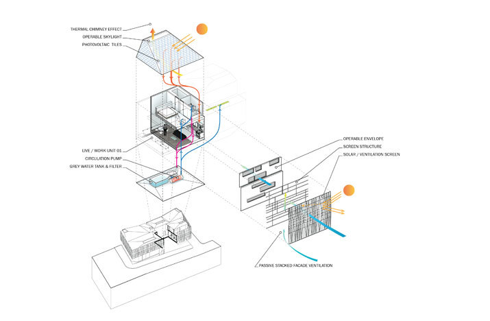 As a development of the stacked program strategy, these elements are wrapped with a performative garter conceptually holding their position. The garter serves to not only unify the disparate elements, but to modify the exposure, privacy, and thermal function of the building skin. In addition to the garter’s contribution to the performance of the building systems, the office suites and residential units employ passive ventilation strategies through the contoured roof forms and their associated operable skylight systems.