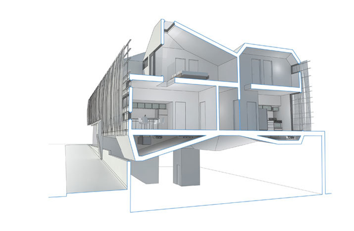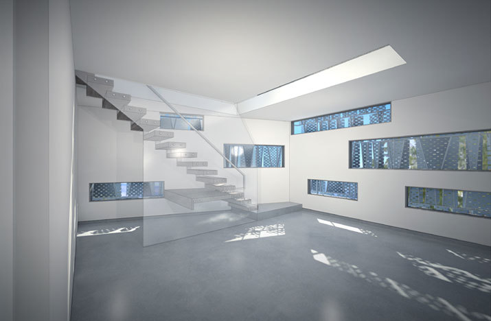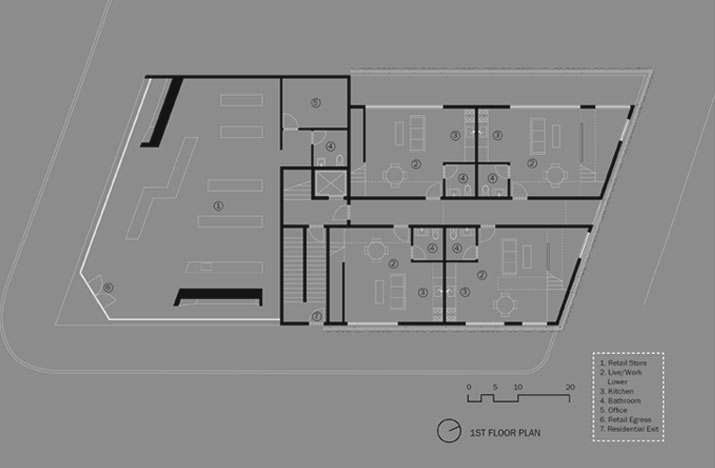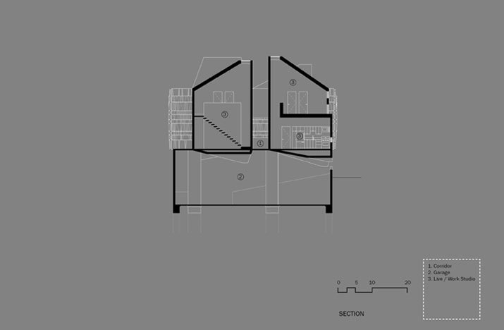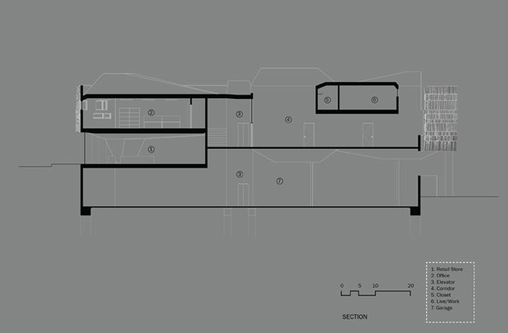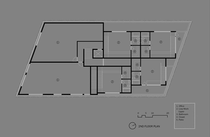 The building strategy isolates three functions – retail, office, live/work studio – and then positions them within the site in their optimal location relative to adjacent site functions. Commercial storefront program is placed along Sunset Boulevard, two office suites above, and four live/work studios at the rear above the subterranean parking to mediate the connection with the neighborhood beyond. The live/work units and the commercial suites are accessed through a shared, but staggered, circulation core. This communal core permits the fluid use of the former as flexible office/studio space in addition to live/work purposes.