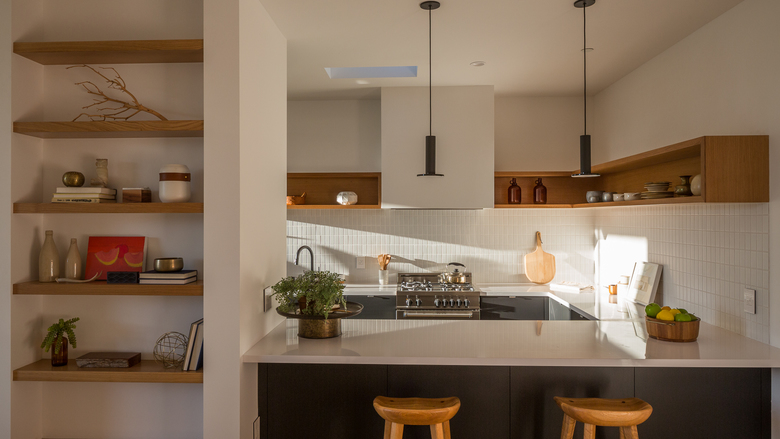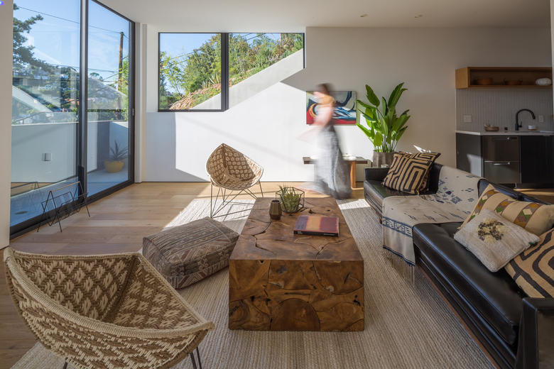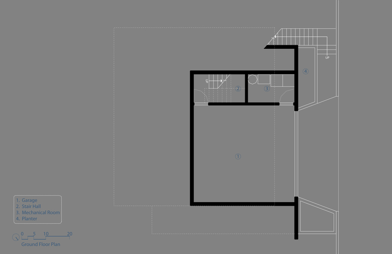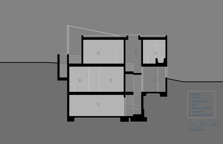 Organized as a rigorously stacked and shifted volume of three levels, the house is situated upon a subterranean garage inserted into the hillside. The second floor, primarily an open plan of living spaces that engage the entry and street facing decks, perceptually expands the interior. The third floor, consisting of the bedrooms, is accessed by a double height interior stair volume that in conjunction with the operable windows and skylights, acts to naturally ventilate the residence and provide circulation to all floors. Strategically located apertures, exterior stairs, patios, and decks around the perimeter connect the home to the multiple and diverse landscapes of the site at every opportunity; these connections serve to expand the useable living space of the compact residence.