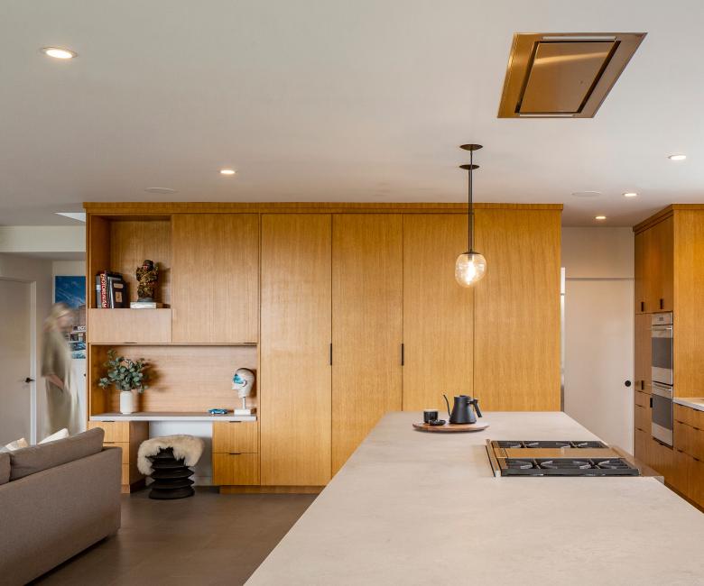 On the ground floor, an open living space forms the center of the home, bracketed by two courtyards that provide direct access to the outdoors, generous natural light, and views of the surrounding coastal landscapes. Telescoping doors and windows extend the living room, dining room, and kitchen seamlessly out to the entry garden and the interior pool terrace. Additionally, guest quarters opening to the rear landscape, and a music studio connecting to a covered terrace, are positioned adjacent to the primary living areas.