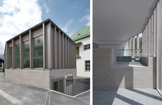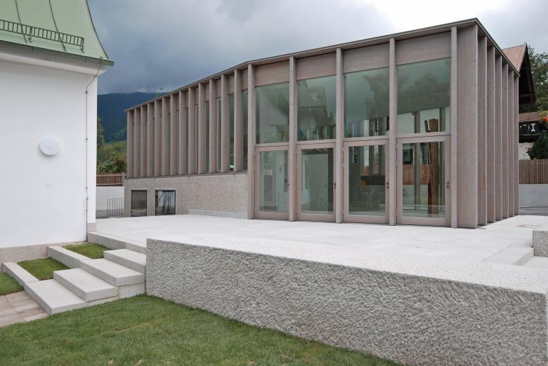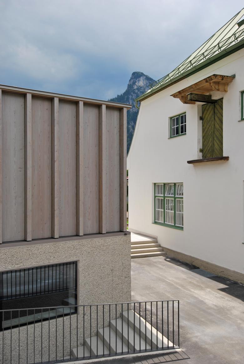 Der Erweiterungsbau definiert sich durch die Bereiche Sockel und Hülle. Der Ausstellungsbereich - durch fließende Niveauunterschiede zoniert - wird von einer Hülle überspannt, deren gefügte Holztragstruktur zum massiv geformten Sockelbereich kontrastiert. Variierende Pfostenabstände erzeugen bereits aus der Ferne betrachtet unterschiedlich transparente Fassadenbereiche.