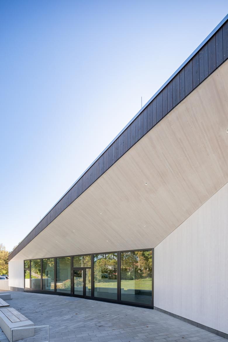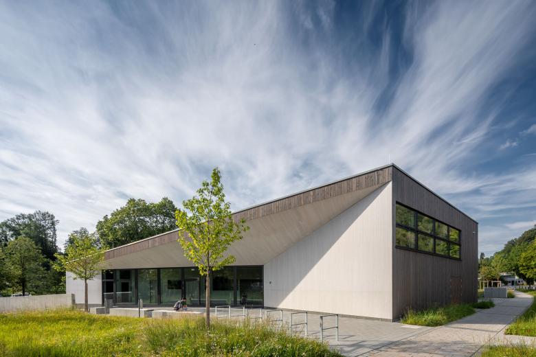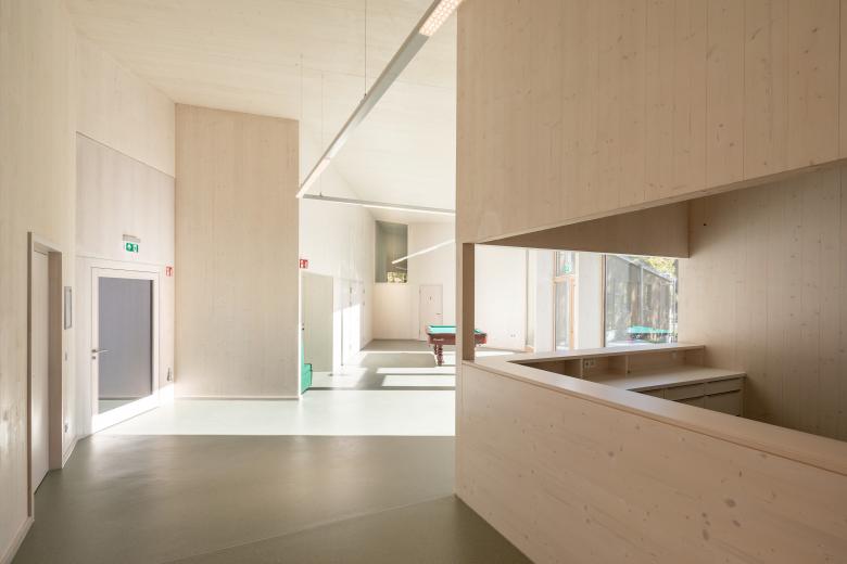 Die komplexe Erscheinung birgt ein einfaches Konstruktionsprinzip mit einem einseitig geneigten Pultdach und nutzt die unterschiedlichen Anforderungen an die Raumhöhen. Wand- und Dachkonstruktion bestehen aus einer robusten Brettsperrholzkonstruktion.