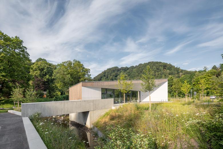 Für den Markt Peißenberg wurde mit einem neuen Bürgerhaus und Jugendzentrum eine „neue Mitte“ geschaffen. Kleine Umformung des Bachbettes und Setzung des Bürgerbüros an markanter Stelle am Bachverlauf schaffen eine sehr spannende und einprägsame Raumsituation.