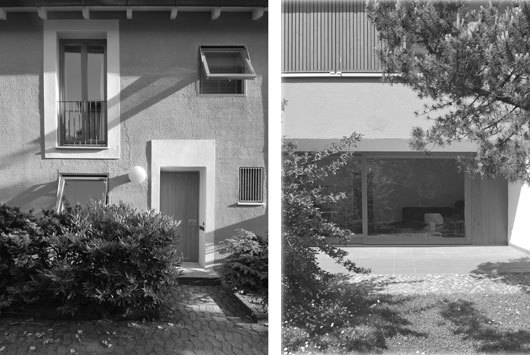 Im Rahmen der energetischen Sanierung und des Umbaus stand auch eine Neugestaltung der Fassade an. Dabei wird der ursprüngliche Charakter des Hauses nicht negiert, sondern durch gezielte Eingriffe herausgearbeitet und mit teilweise überhöhten formalen Mitteln der Erbauungszeit gestärkt. Gleichzeitig wurden bauliche und energetische Mängel beseitigt. Die Farbgestaltung bezieht sich auf die ursprünglich vorhandenen, sehr gedeckten und dunklen Farbtöne. Gravierende vorhandene Wärmebrücken wurden durch Dämmen der Decke über dem erdgeschossigen Rücksprung und Entfernen der ungedämmten Rollladenkästen beseitigt. Die durch diesen Eingriff vergrößerten Fenster erhielten als Sonnenschutz Schiebeläden. Durch den Einbau eines großen Hebe-Schiebe-Fensters wurde der nach Süden orientierte Glasanteil erhöht, im Winter sind solare Wärmegewinne möglich, im Sommer wird die Verglasung durch das vorspringende 1. Obergeschoss verschattet.