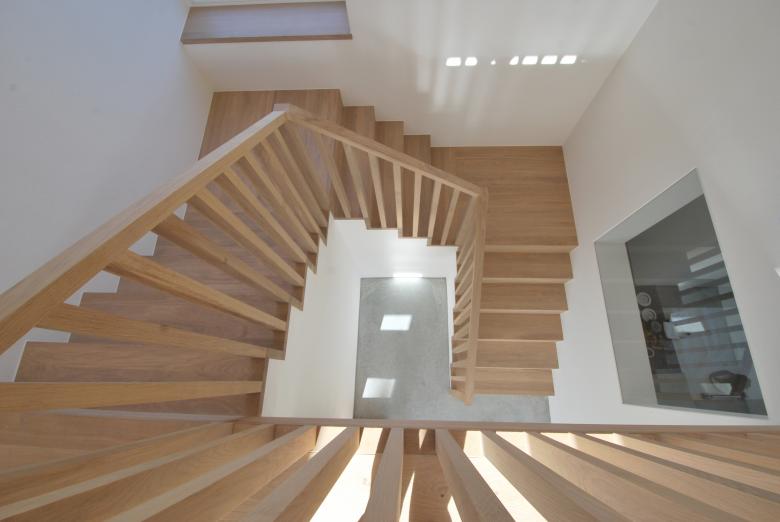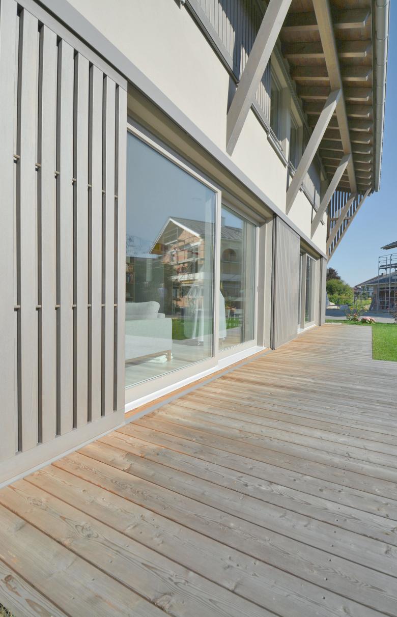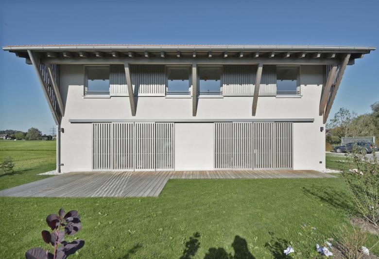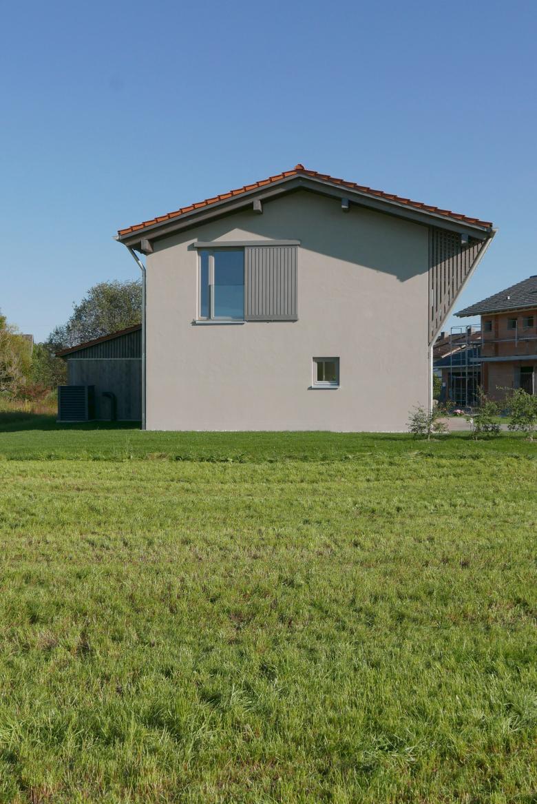 Das Wohnhaus orientiert sich mit seiner Baumasse und dem ausgeprägten Dachüberstand an der ortstypischen Bebauung der Region, dabei geben die schlanke Bauform und die einprägsame Fassade dem Haus einen eigenständigen Charakter. Die Wohnbereiche orientieren sich über zwei Geschosse verteilt nach Süden. Grosszügige Öffnungen in der Südfassade ermöglichen eine passive Solarenergienutzung und verringern - in Kombination mit einer Nebenraumzone als Wärmepuffer im Norden - den Heizenergiebedarf.