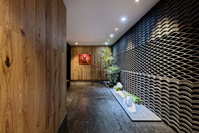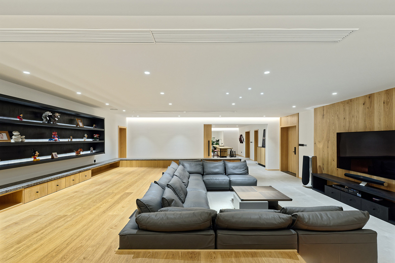 ダイニングに隣接する調理人用のバックキッチンとは別に、客と調理を楽しめるオープンキッチンカウンターも設けている。このカウンターはインナーガーデンのある窓際まで伸びている。窓がないダイニングルームとリビングとの間には3.8mの大きな木製引き戸を設置し、全て開くと、ダイニングとリビングを連続させることができるようにした。リビングのソファーとテレビ台の間のスペースはダイニング、キッチンへと続いており、リビング側の窓から反対側の窓までの23mの距離を突き抜けるように構成されている。リビングの上げ床、ダイニングテーブル、キッチンカウンター、書斎など広い空間の中で溜まりとなるような場所を設け、低く抑えた棚や、カウンターなどで、広がりがありながら、動きを明快に規定できる動線空間をつくり、緩急のある空間構成を目指した。