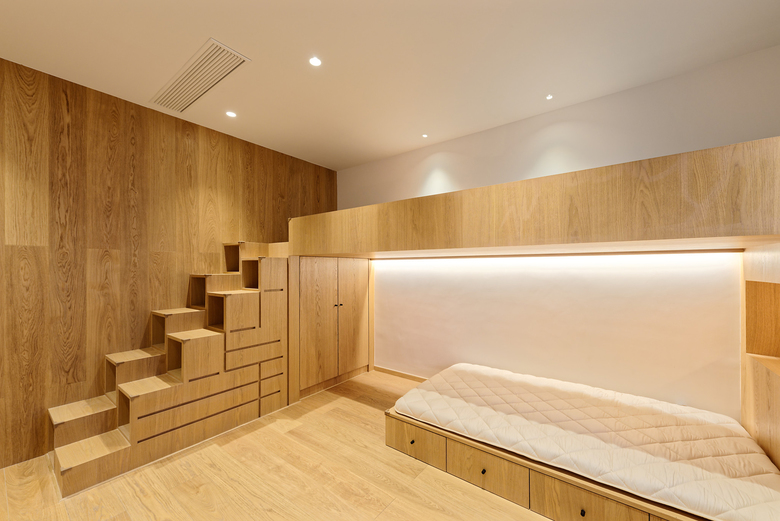 リビングの中央にはソファと一体化した上げ床のファニチャーを設け、横になったり、ヨガができるようにした。床レベルに変化をつけて空間に立体感を与え、また床に座ることでアイレベルを低くして、天井を高く感じられるようにしている。上げ床の両端部は低い棚を設け、もともとバルコニーだった部分は麻雀卓を置けるような窓際のスペース、ダイニング側には寝室に続く通路になっている。