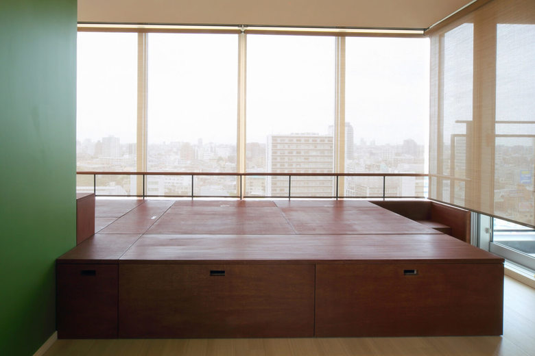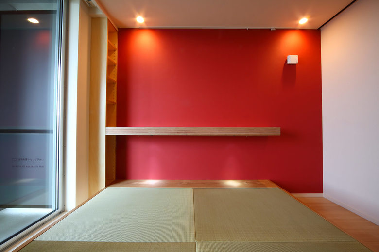 One of the two bedrooms is a small working space combining a loft bed with a large desk and bookshelves. For the other bedroom, we placed specious tatami bed and a shelf with recessed down lights by the pillow to be able to read book while lying on the floor. Renovation of New residence tower.