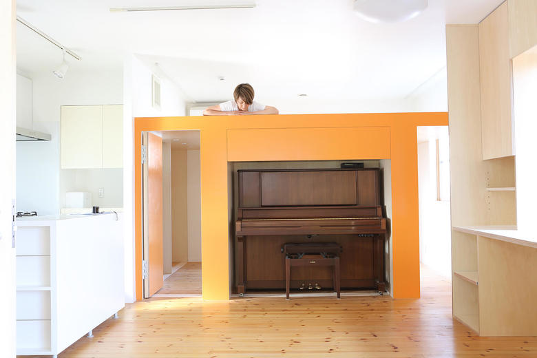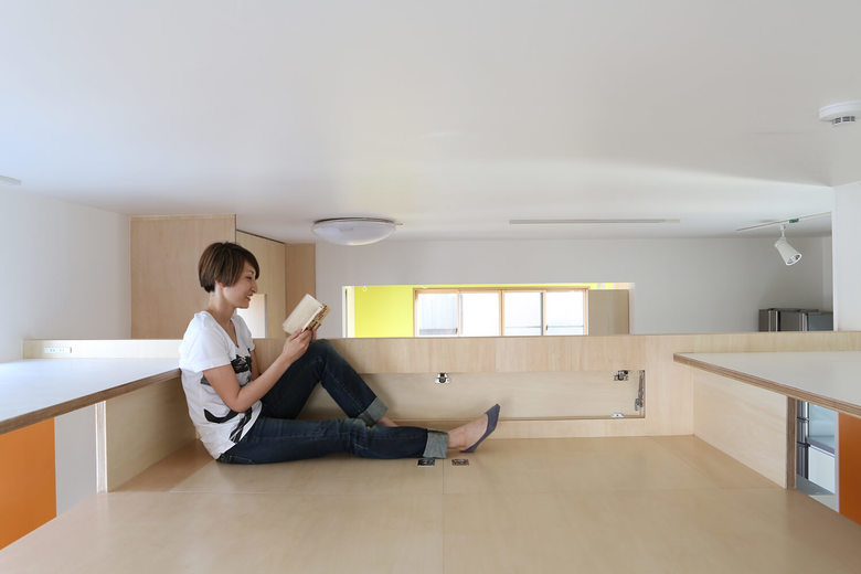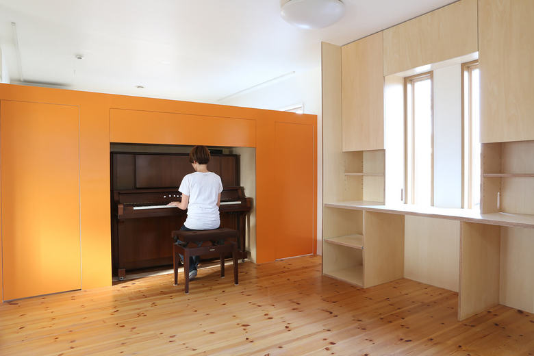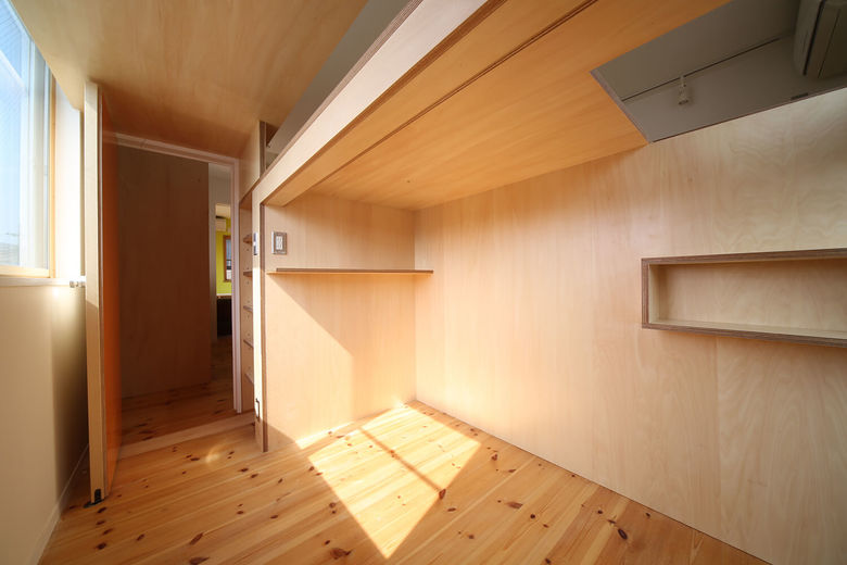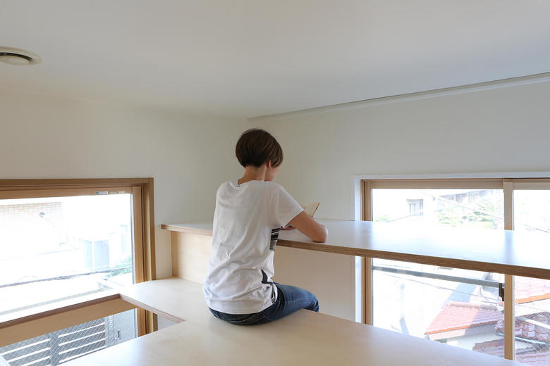 This three storey house is 10 years old residence with a precast concrete structure. We have renovated a part of 2nd and 3rd floor as an owner`s residence, and the rest is for rent. A box was proposed like big furniture to improve usage of kids space by combining beds and desks together. The bottom of the furniture is separated into two bedrooms. The top part is a kids play area, and at the same time, it functions as their study desks. The desk is a corridor ceiling which connect to their bedrooms. While they use their desks, legs will stick out to the corridor. The kids’ area is opened towards the kitchen and the living room so that the family can communicate easily.