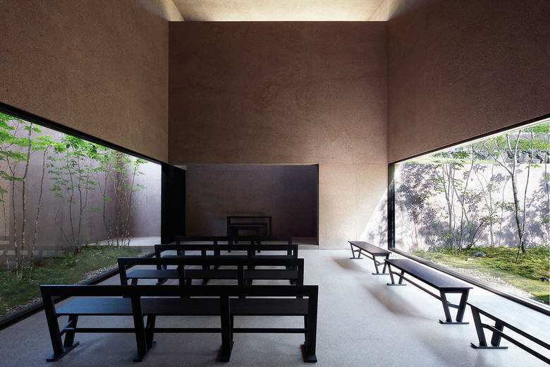 The programme is formally arranged under a single, sloping roof plane, following the view line from the entrance up to the shrine. The rooms of the visitor centre open onto the courtyard garden while the secluded chapel remains separate. It can be reached via a discrete corridor, directly accessed from the outside or up a gentle ramp from the garden. An unadorned and quiet room with minimal heating and artificial lighting offers a non-denominational contemplative space, pure in its form. Relying on indirect sunlight from the gardens on either side, the chapel visitor finds seclusion and their focus is drawn to the essential rhythms of time through the natural indicators of daylight fluctuation and seasonal foliage changes. The planting of all the gardens is inspired by the palettes and textures of Japanese meadows and woodlands and a selection of grasses, shrubs and wildflowers are carefully juxtaposed.