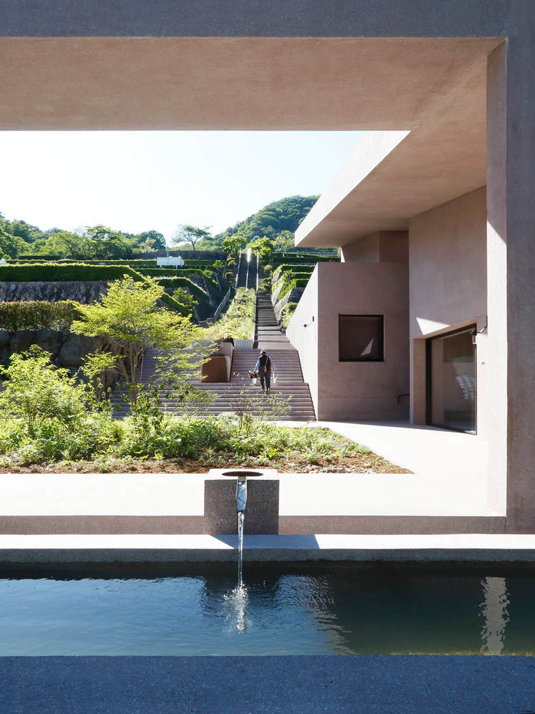 Inagawa Cemetery is located on a steep site in the Hokusetsu Mountain Range of the Hyogo prefecture, approximately 40 kilometres north of Osaka. The cemetery is laid out across terraces and bisected by a monumental flight of steps leading up to a shrine at the highest point – an axis that orients the whole project.