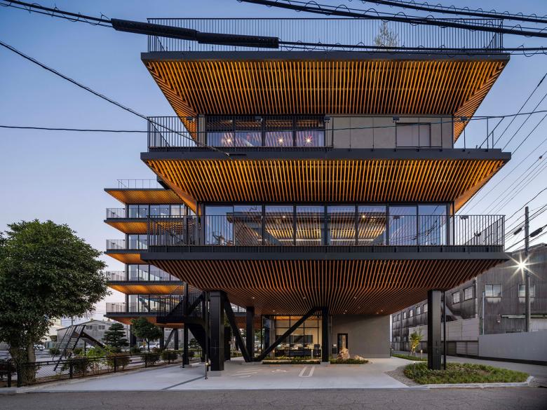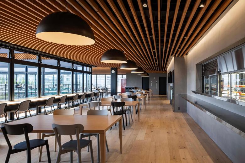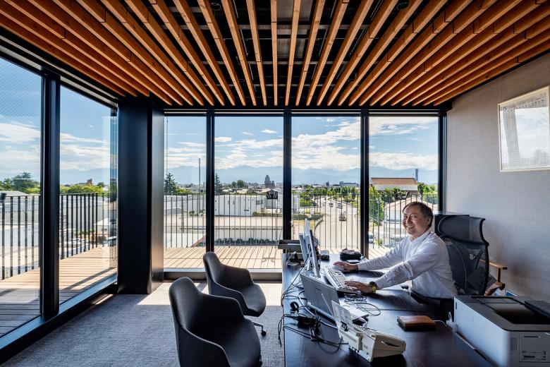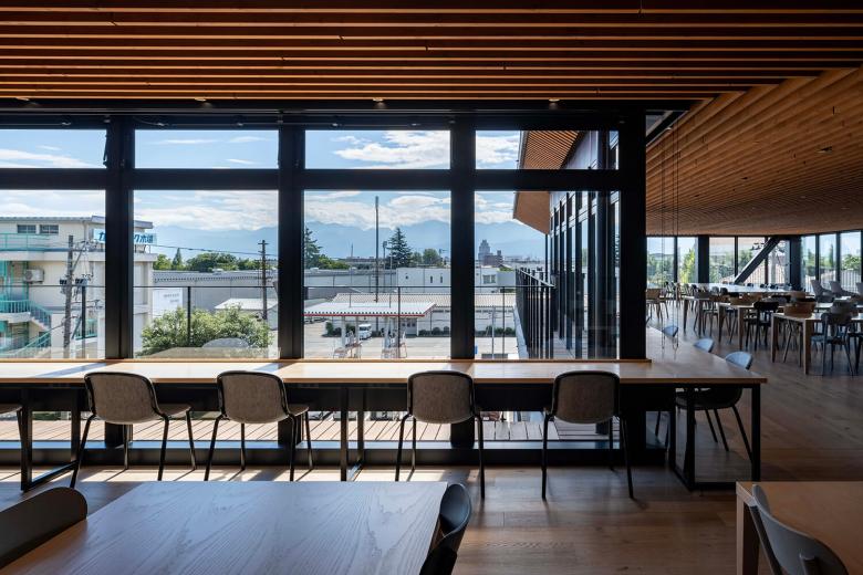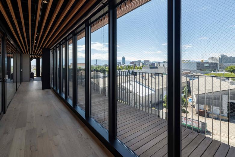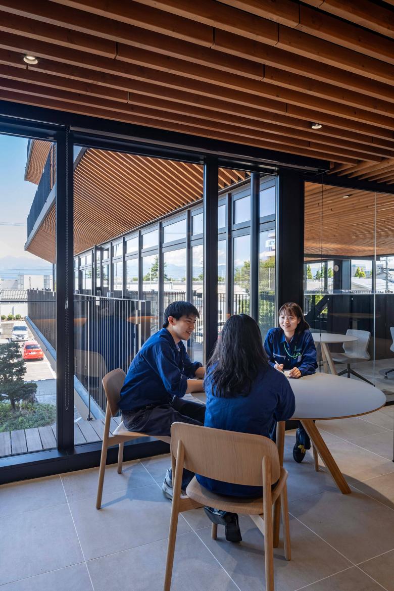 The full-glass façade provides views of the surrounding industrial park, the Jintsu River to the west, and the Tateyama mountain range to the east. An outdoor deck wraps around the façade and provides a buffer to the perimeter of each upper floor. Interior ceilings are fitted with louvers made of Japanese pinewood, and the louvers extend outward and adorn the eaves above each deck. The resulting space has a warm natural feel like being under tree cover.