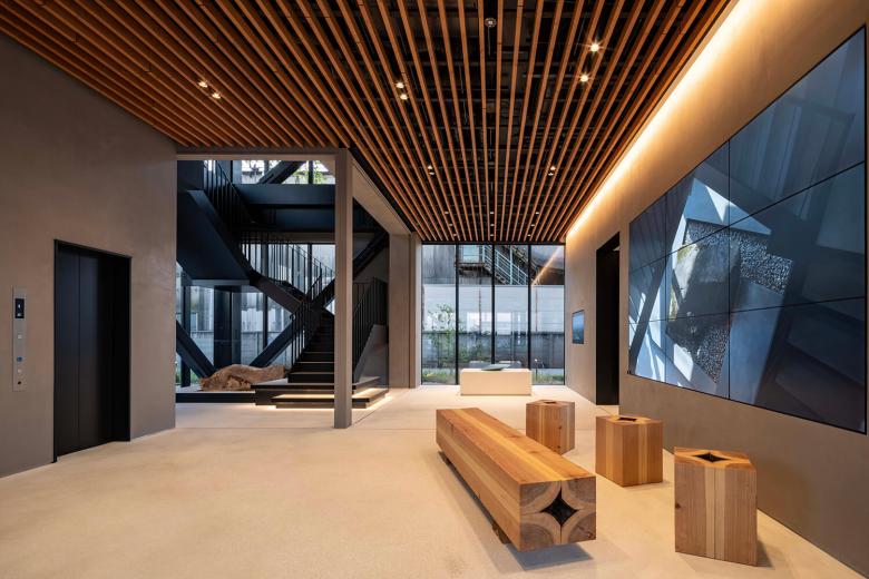 Because the site lies within the Jintsu River floodplain, the raised ceiling built to counter natural disaster for the building’s upper floors is also laid with wooden louvers, partially curved to evoke the bottoms of the kitamae trading boats that supported the maritime transport and the medicine traders of the Japan Sea in the past.