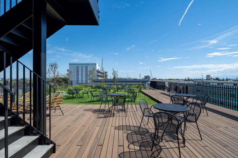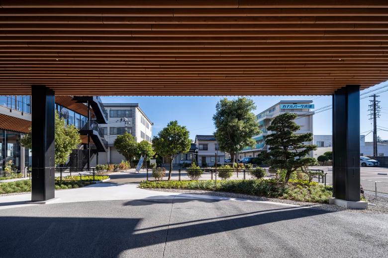Medicinal herbs, found among Toyama’s wealth of forests, and trees common to large local estates are planted beneath the raised ceiling space. The area is contiguous with the park and permits nearby residents and visitors to freely stroll the greenery, to which employees have immediate access.
