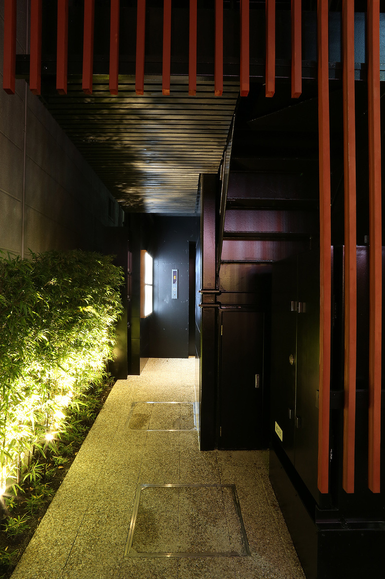This multi-story building was designed for lease to Japanese restaurants. With its wooden tategoshi, or verticle latticework, painted with a traditional red-ochre Japanese paint, the building attracts attention even from a distance. The latticework softly overlays exterior staircases, emergency escape balconies, windows, and other elements of the building, filtering bright sunlight and lending privacy to the interior.