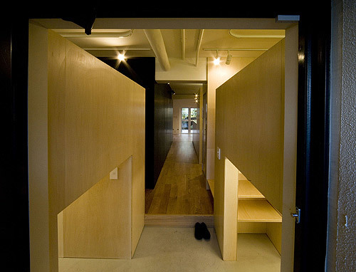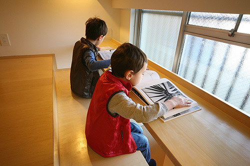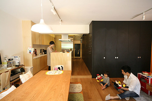 This flat is part of a project to fully renovate a 21-year-old building formerly used to house company employees. The floor plan is divided roughly into two halves, with the kitchen and bath in the center. The field of view opens out as one enters more deeply into the unit, emphasizing the brightness and expansiveness of the living room and private garden. To the immediate right and left of the entryway, two boxy lofts provide sleeping areas above and ample room for camping gear, a baby buggy, or other large items underneath. The privacy of the sleeping areas is ensured via a half-wall. The unit is full of similar creative details such as stairs that function as bookshelves and a window-seat desks in front of the windows in the lofts.