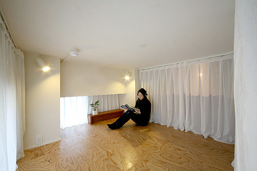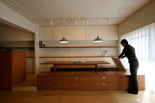 This flat is part of a project to fully renovate a 21-year-old building formerly used to house company employees. Aside from the kitchen and bath, the unit is a completely open skeleton that can be molded to the needs of the residents by rearranging various items of furniture. By changing the height of the floor, however, we were able to create gentle partitions within the open space. Examples include the spacious living area and raised sleeping area with storage space and plumbing underneath, the sunken “kotatsu”-style dining area, and the open kitchen.
